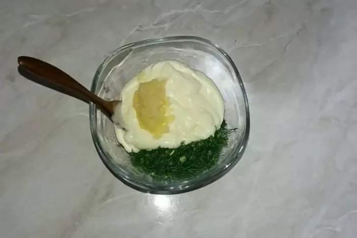 4. Готовим крем для нашего торта.Нарезаем мелко укроп и смешиваем с майонезом или сметаной, солим, перчим и выдавливаем чеснок.