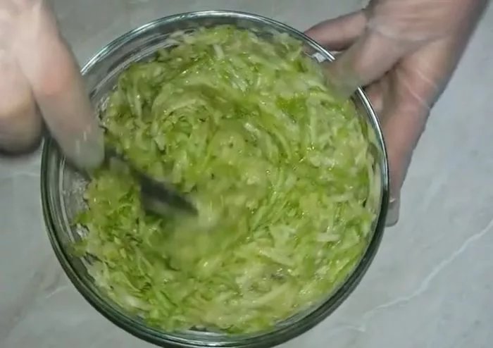 2. В кабачковую массу всыпаем муку, снова вымешиваем. Тесто должно получится по консистенции как густая сметана.