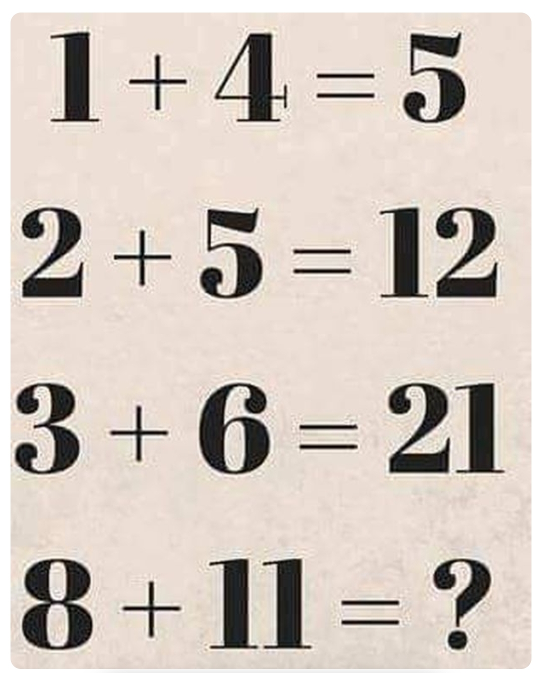 В левой части пары цифр последовательно, 1-4, 2-5, 3-6,4-7,5-8,6-9, 7-10,8-11. Разница между каждым последующим и предыдущим результатом в каждой паре увеличивается на 2.