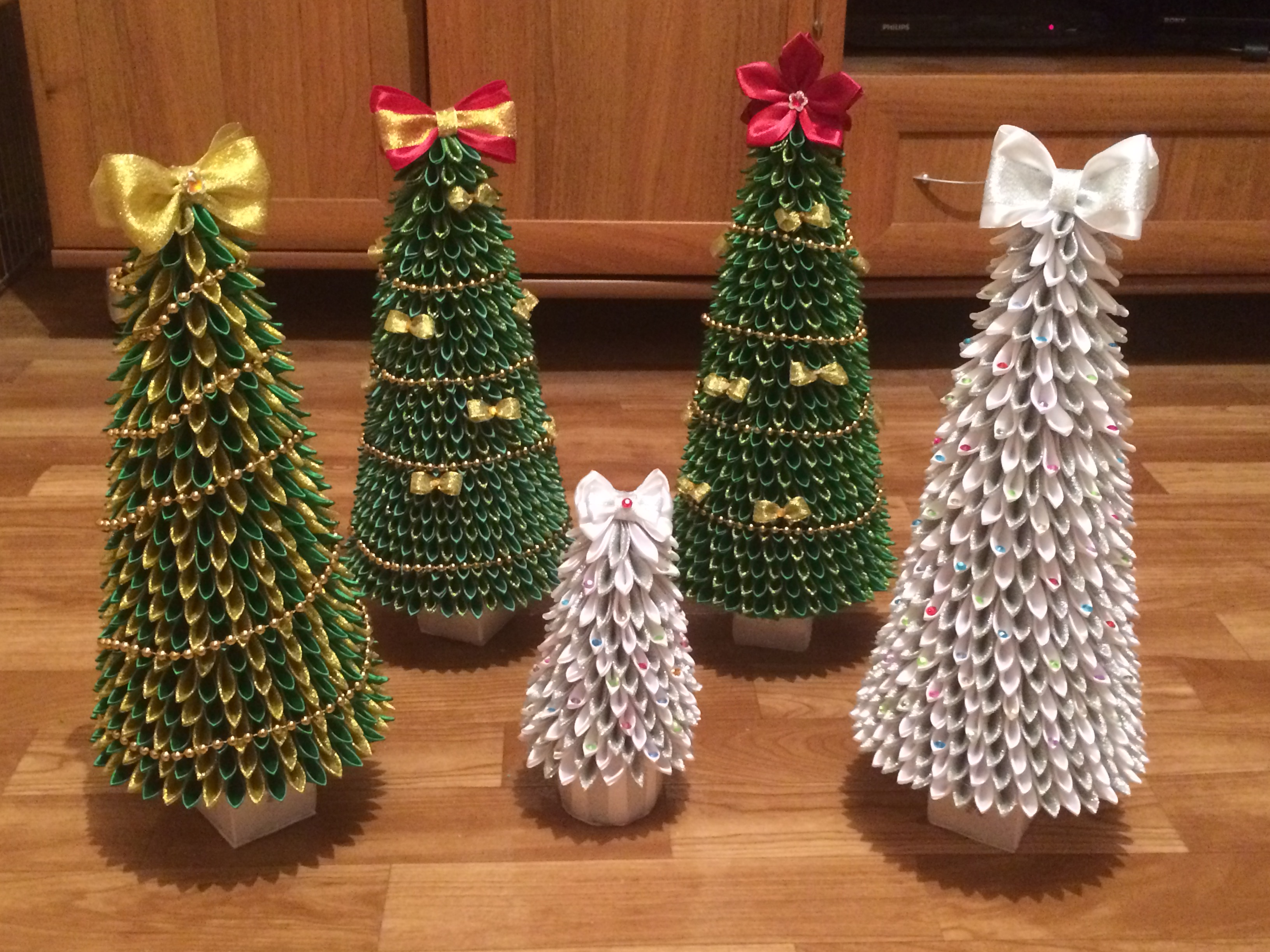 И я замучала себя такими елками) Заказали 6, но я успела только 4) Больше я елки не делала:facepalm: 4-по 50 см., маленькая 30. Сейчас уже не помню, сколько лепестков сделала, но пипец как много)