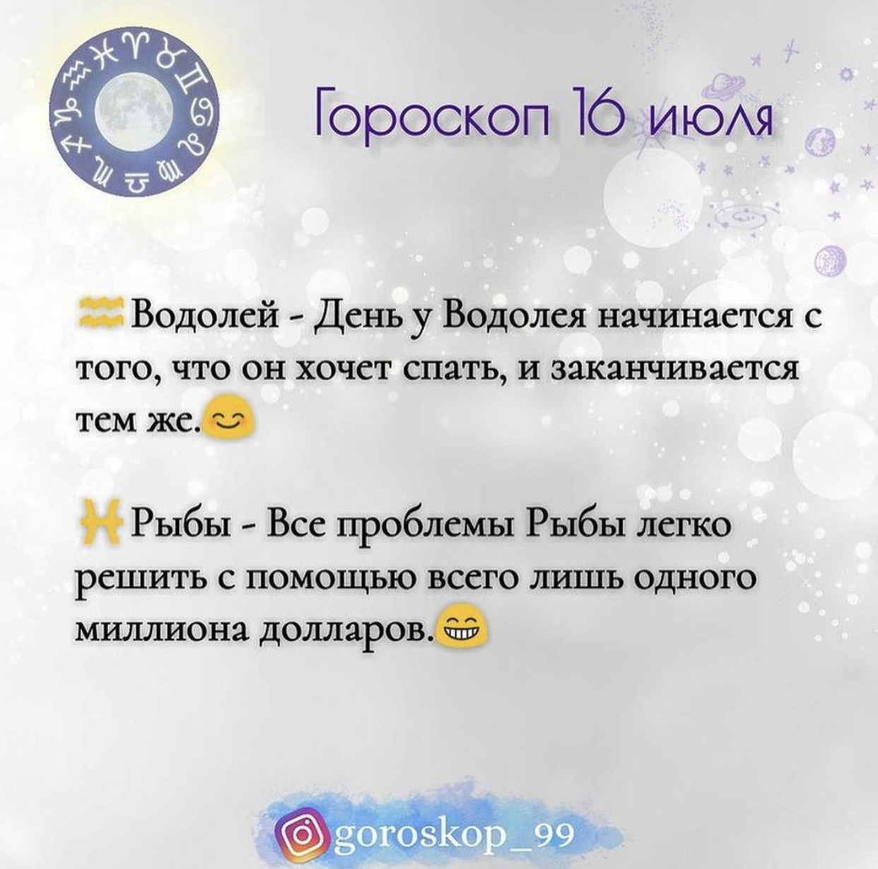 Иринка111 Команда форума V.I.P V.I.P за Игровую Модератор раздела все о курении Сообщения 91.793 Реакции 257.695 Дневник Читать »» Не курю с 08.06.2017 Метод Сила Воли 16 Июл 2021 #7.505 Nat-Natali написал(а): Гороскоп на сегодня, хорошенько отдохните Посмотреть вложение 1446670Посмотреть вложение 1446671Посмотреть вложение 1446672Посмотреть вложение 1446673Посмотреть вложение 1446674Посмотреть вложение 1446675 Нажмите для раскрытия... Сегодня мне подсунули не мой гороскоп... Что значит, в голове каша???
