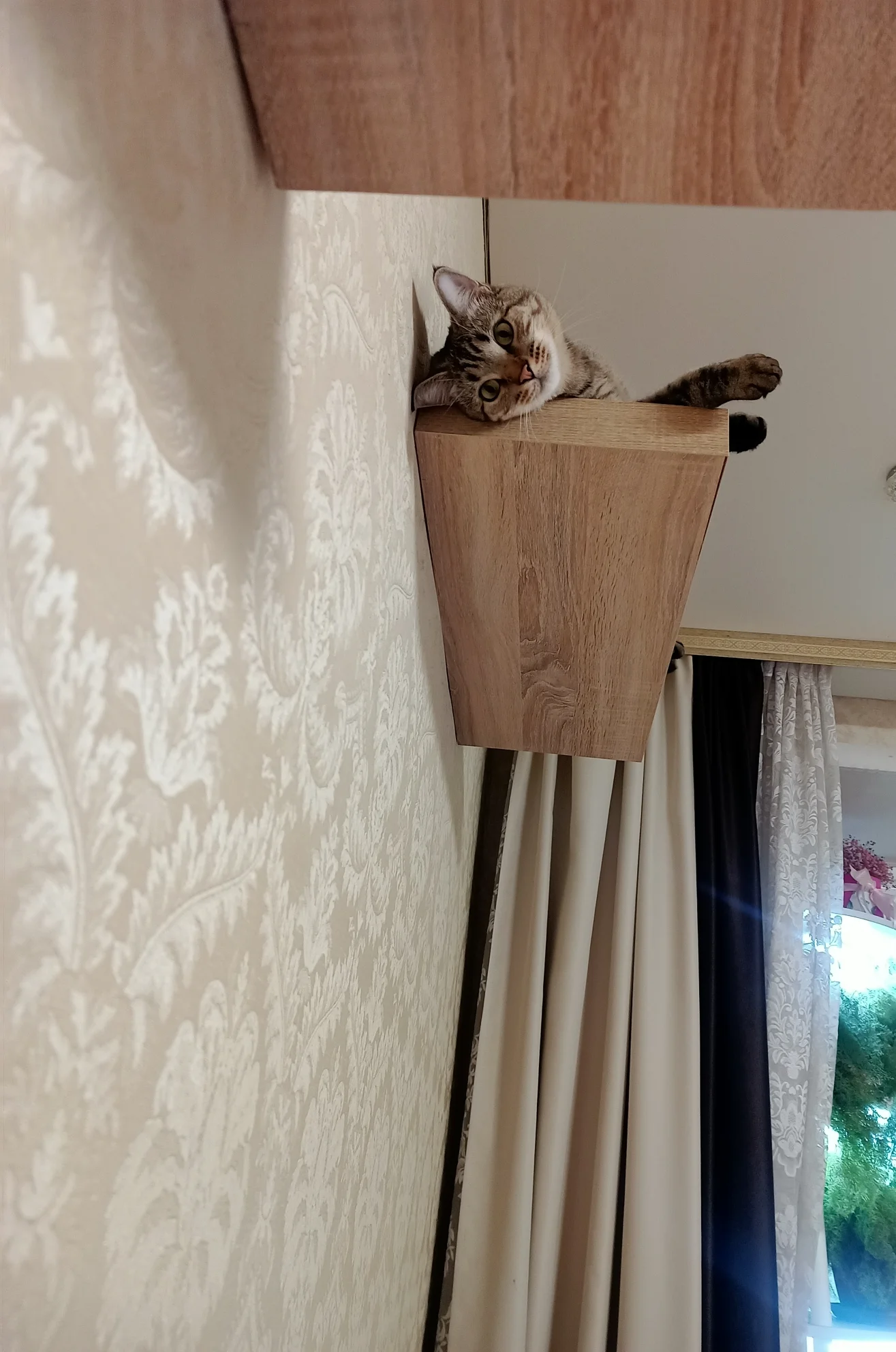 но Ириска решил по своему) методично, раз за разом всё с полок лапкой скидывал, пришлось полки ему уступить😁