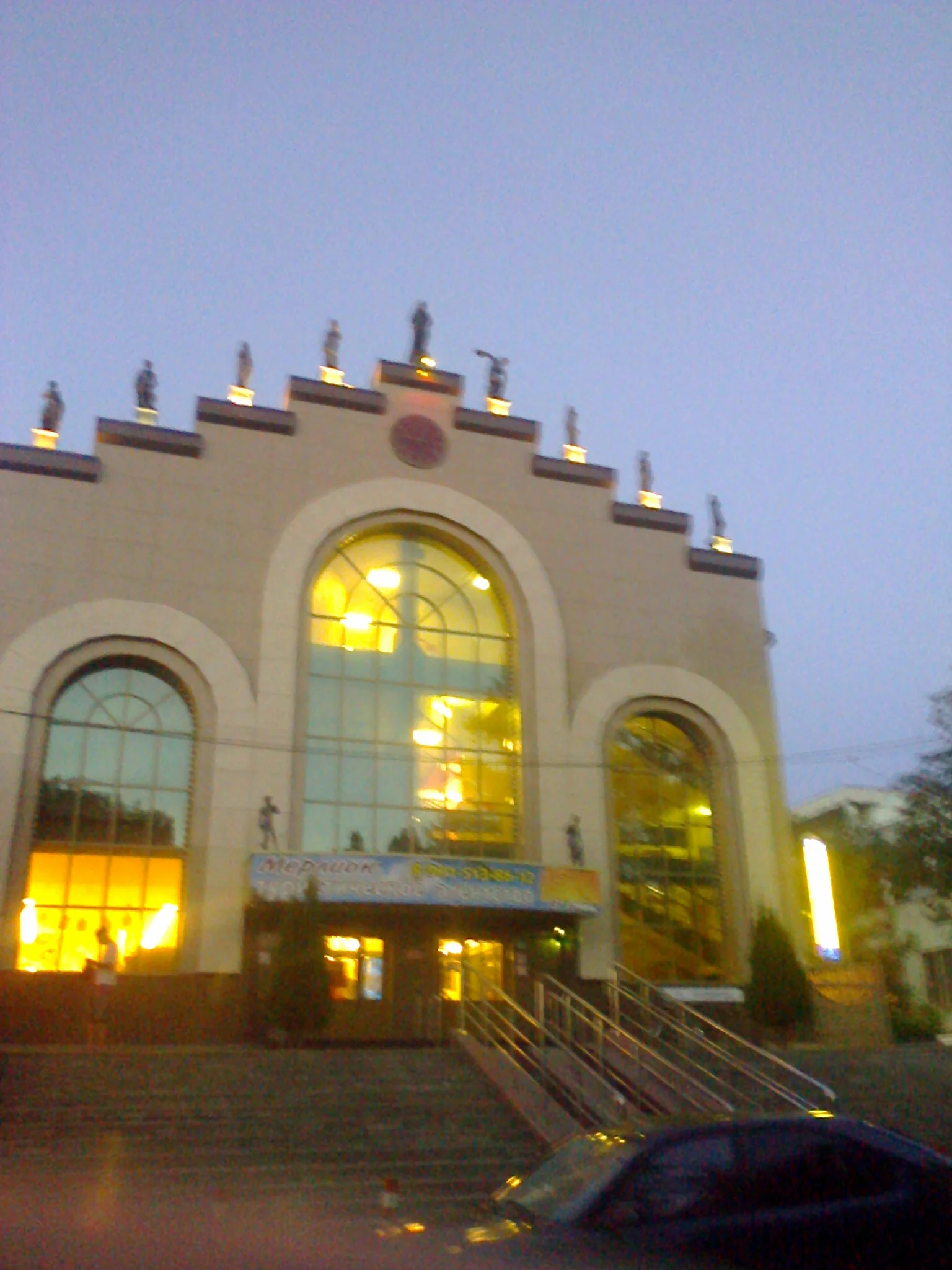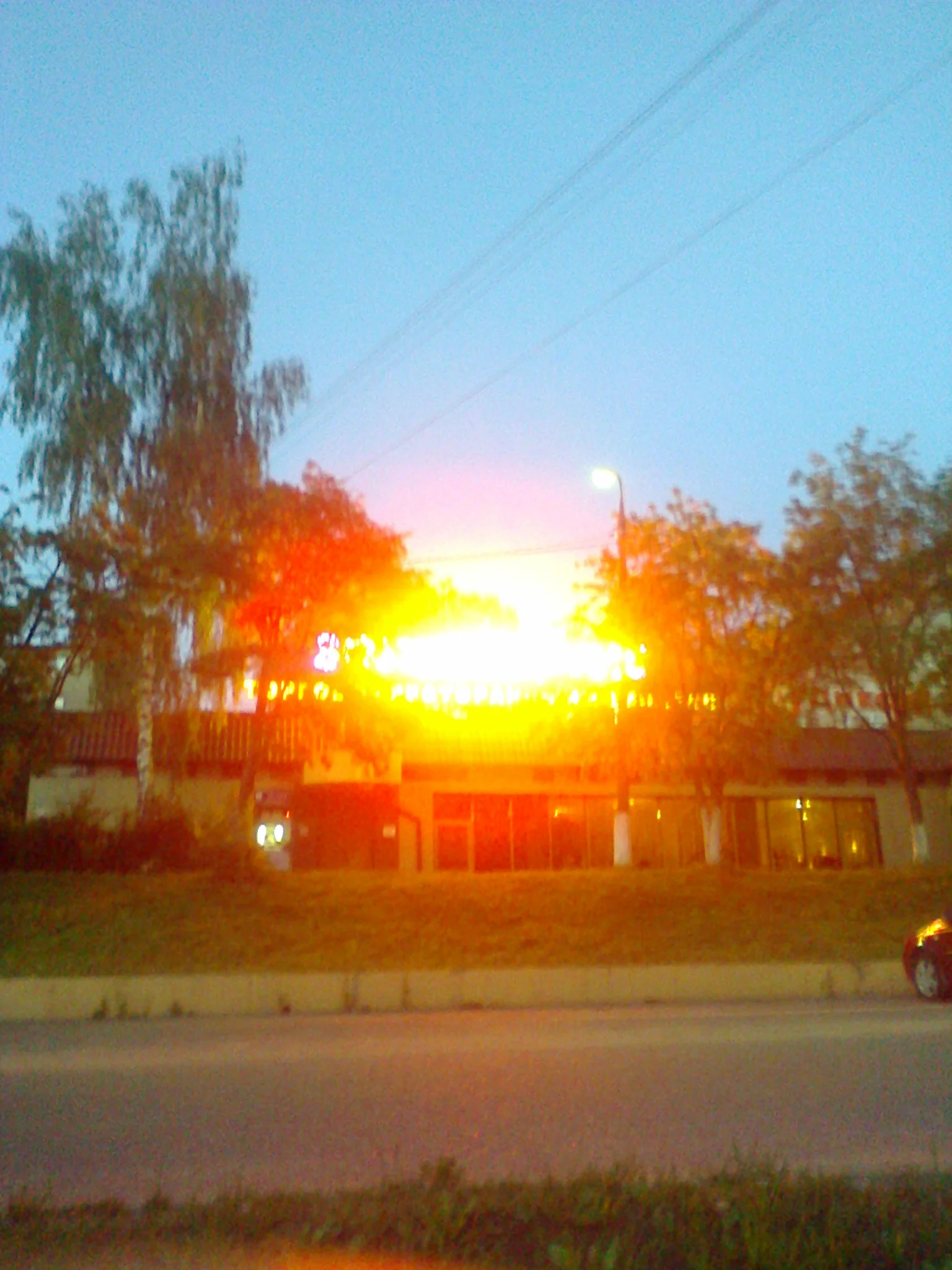 Вечером гуляла, сфотала ресторан "Золотое руно". Его надпись горит разноцветными буквами, красиво так, но получился на фото пожарчик. А рядом здание торгового центра.