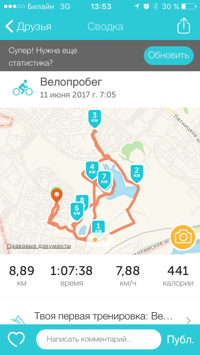 8,4 км , 55 мин Я то не купался ... А вот мой товарищ как положено- три раза окунулся ...Ну а потом ничего интересного не происходило После пробежки загрузили поломанный байк в машину и поехали в ближайший триал- спорт , где нам заменили детали переключения передач - вышло около 5 тыс, руб. Ну и цены я скажу вам на современные велики : Всё.....