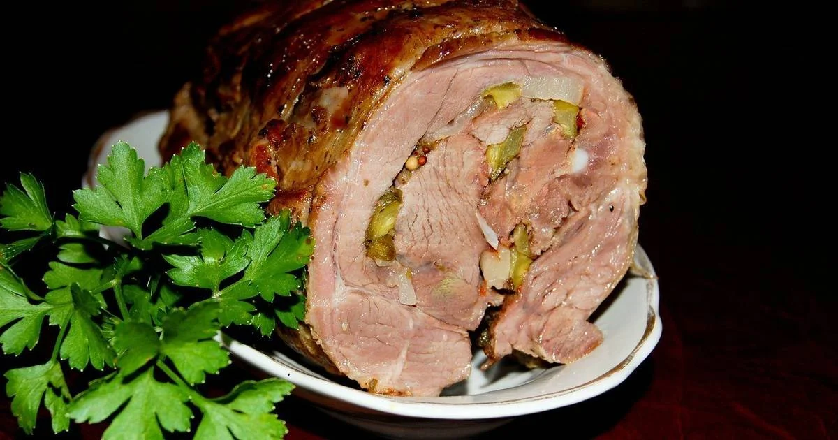 Приготовление: Из мякоти мяса нарезать 4 плоских куска величиной с ладонь, очистить от пленок, отбить, посолить, посыпать перцем, а затем на каждый кусок мяса положить по несколько долек соленого огурца и крутого яйца, полоски шпика и нарезанную соломкой в длину сырую картошку.