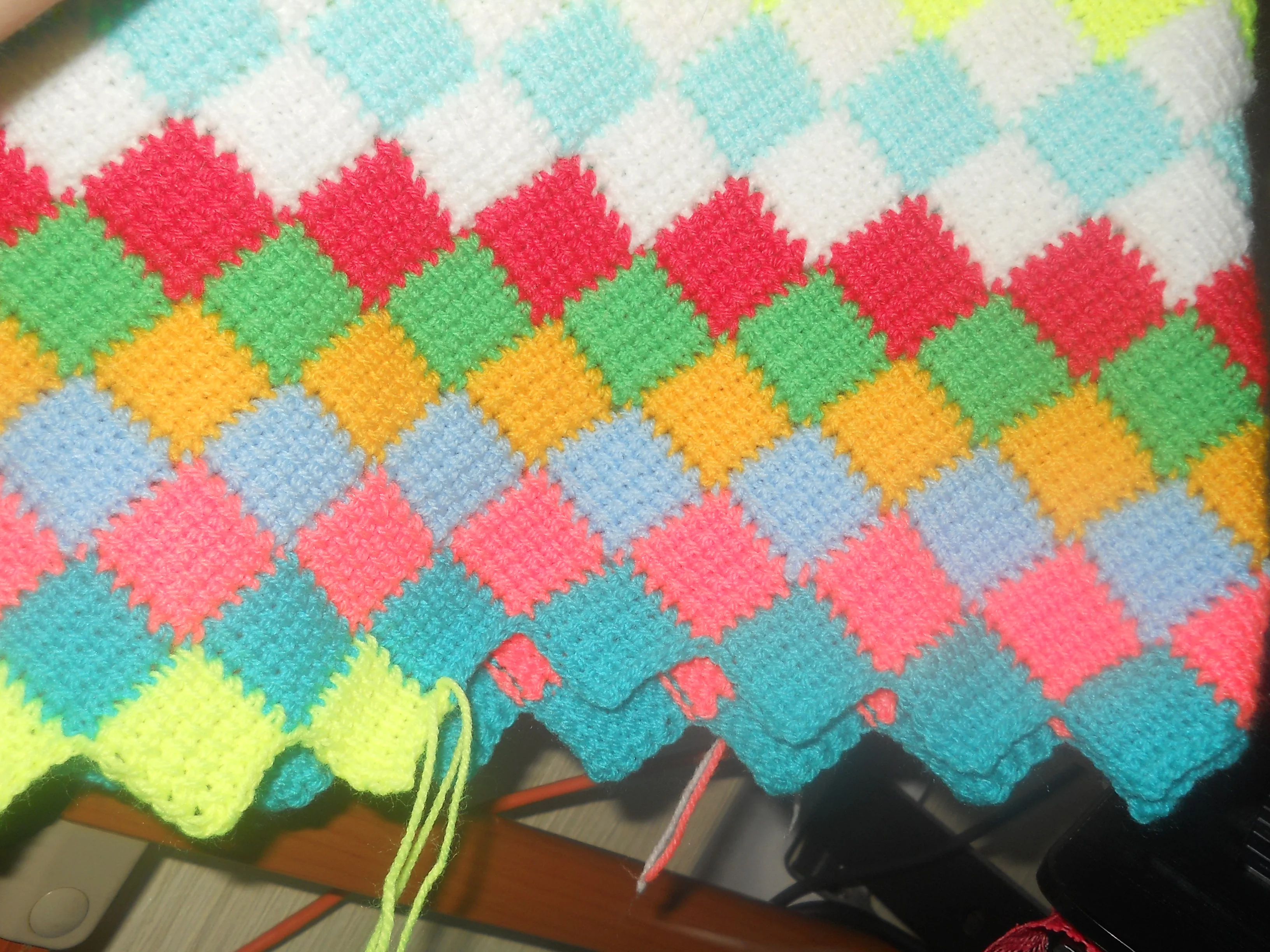 ... с мамой вообще не знаю как быть , как помочь ... то давление , то головная боль , глаза плохо видят ... боится ослепнуть ... ну как будет смотреться))) круто будет смотреться))вот притащила вам свой плед : первая половина - чередовались цветные ряды с белыми , а сейчас вяжу вторую половину - просто цветные ряды ... не знаю как это будет смотреться