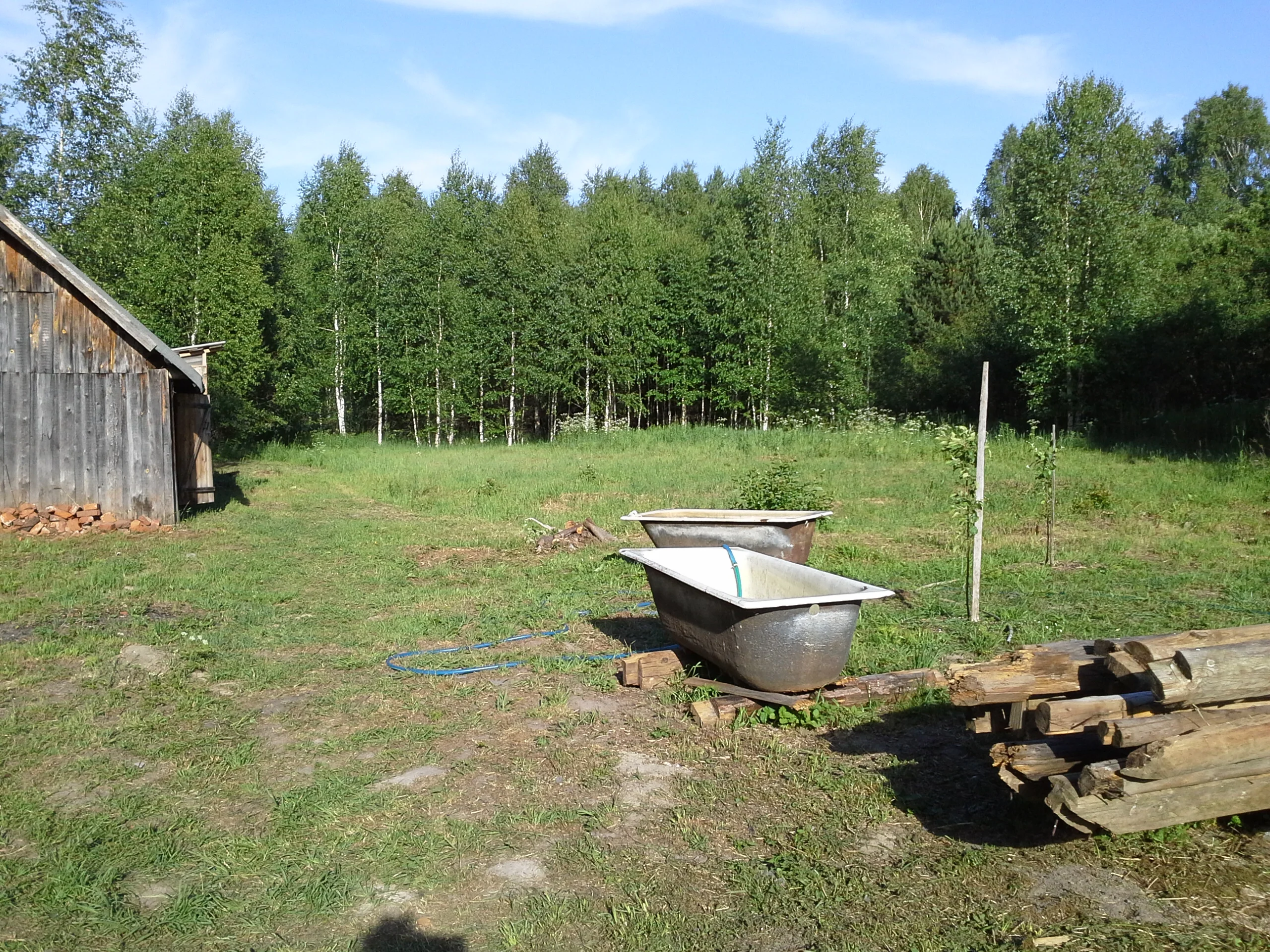 У нас фикзнает скока... Короче, до первых березок... Это картофельное поле было. Точнее там, за березками в паре метров поглубжее, есть черемуха. Так вот, это граница нашего участка... Там недавно еще поле было... До дороги...
