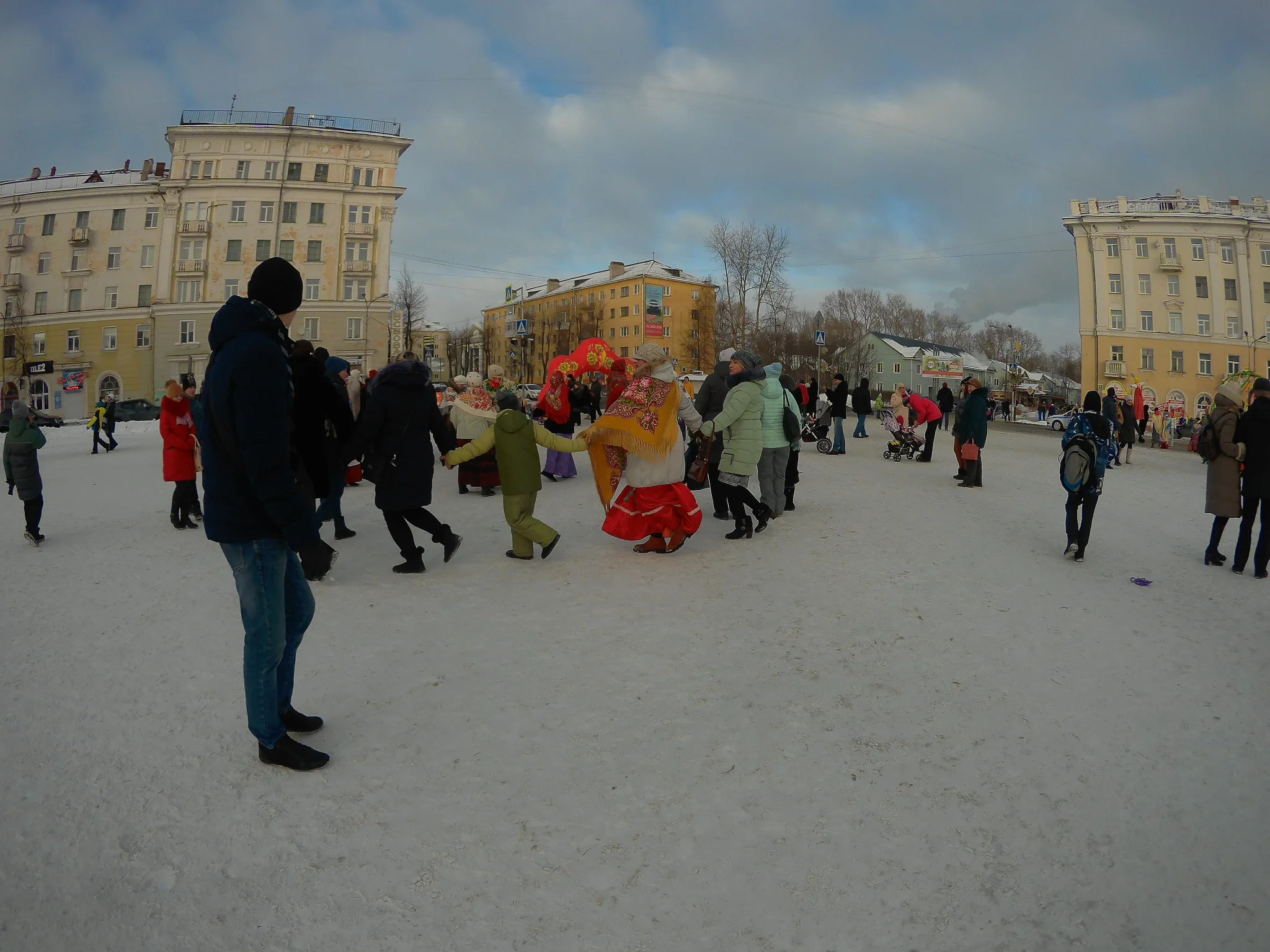 В конце действа, народ собрался в колонну и пошёл в сторону парка палить чучело зимы.