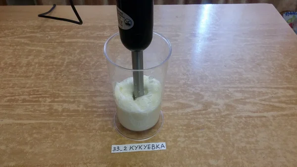 3. Включить блендер и начинать взбивать не двигая и не приподнимая блендер, пока всё не перемешается. Только потом можно уже приподнимать и опускать блендер, чтобы лучше перемешать растительное масло, которое осталось вверху.