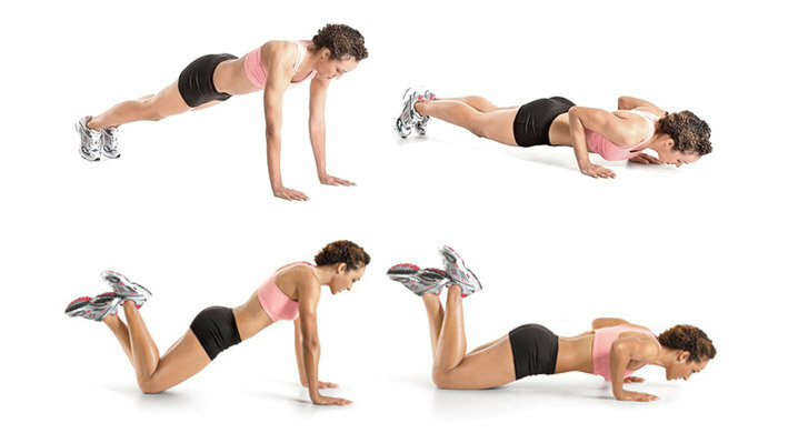 Исходное положение: принимаем упор лежа, располагаем руки на ширине плеч, упираемся коленями в пол, при этом голени отрываем и скрещиваем друг с другом. Поднимаем корпус на выпрямленные руки таким образом, чтобы бедра, спина и шея были в одну линию.