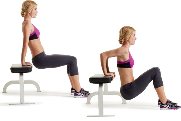 С выдохом выпрямляйте локти и вернитесь в исходное положение на прямых руках, тазом не касаясь скамьи»