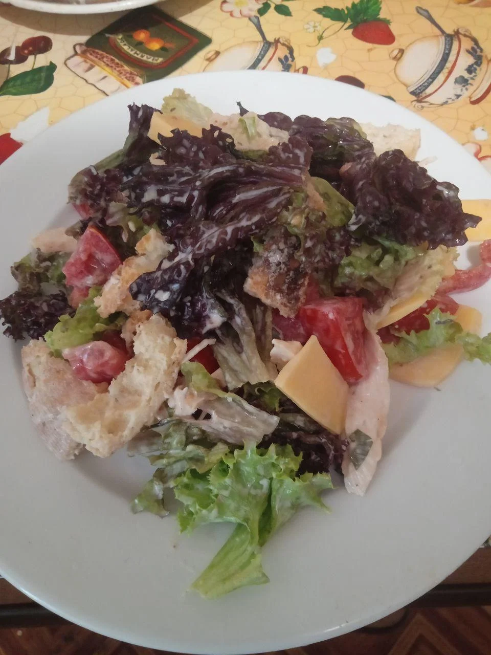 Салат "Цезарь" -идеальное сочетание белка и клетчатки на ужин ( не считая сухариков)))) но их мало). Нам понадобится грамм 300 куриной грудки, 150 г твёрдого сыра ( в ресторанах используют пармезан, я беру любой твёрдый сыр, гауда,цезарь т.д.), помидор, листья салата, сухарики -сделать самим из багета, не покупайте из магазина с глутаматом натрия(((( В пиалу рвём клочьями листья салата, также поступаем с куриной грудкой- её нужно предварительно обжарить на сковороде и присолить, и потом можно также разорвать на не сильно мелкие части, нарезаем сыр (я нарезаю крупными пластинками-увидела так в одном злачном месте)))), нарезаем помидор, можно использовать черрики,я взяла обычный, добавляем сухарики и заправляем соусом "цезарь",я купила готовый. Можно сделать самим-желательно домашний майонез+чеснок+оливковое масло. И вуаля-ужин готов)))) Из такого количества продуктов минимум получается 3 большие порции такого салата. Приятного аппетита!!!!