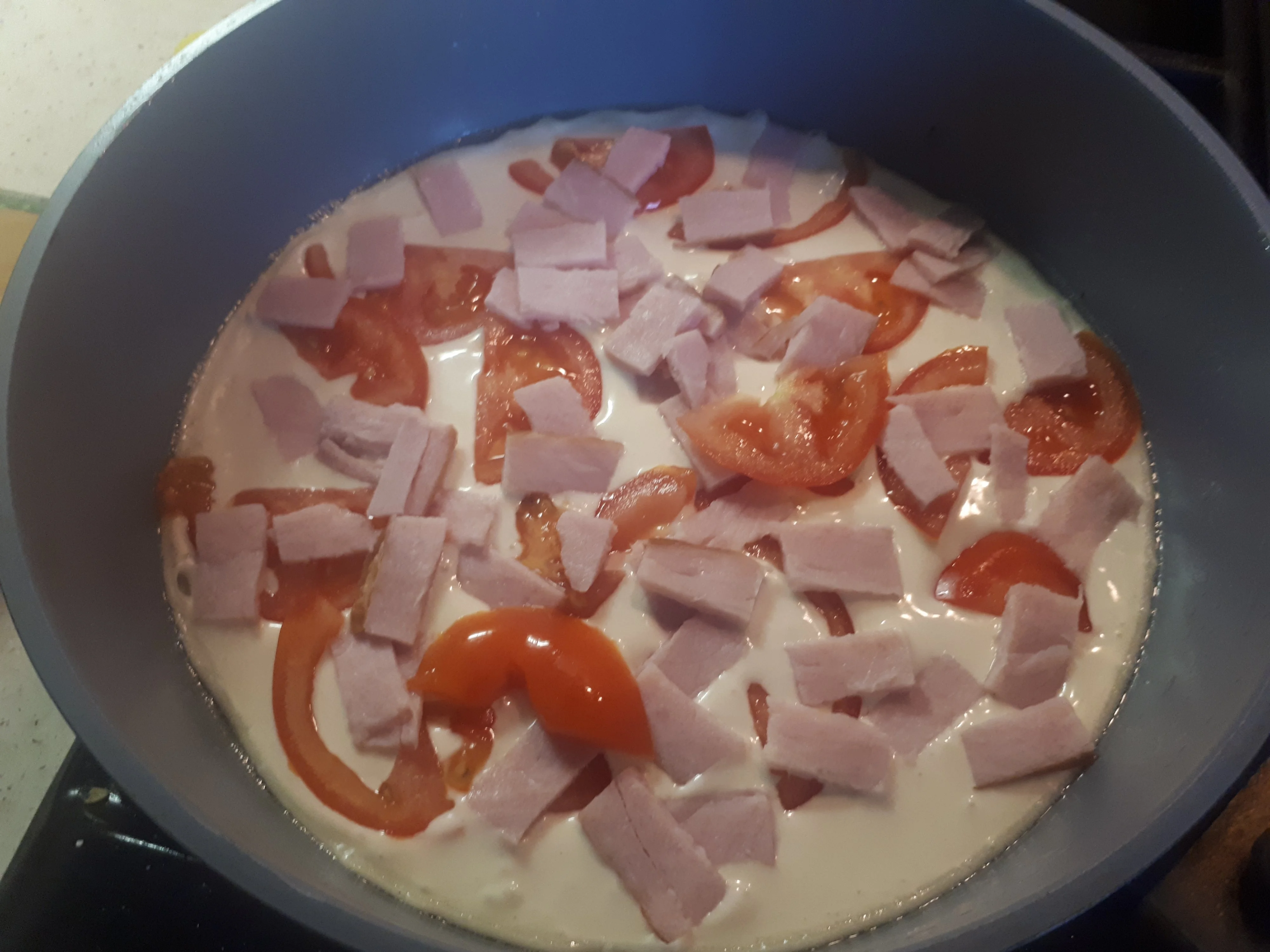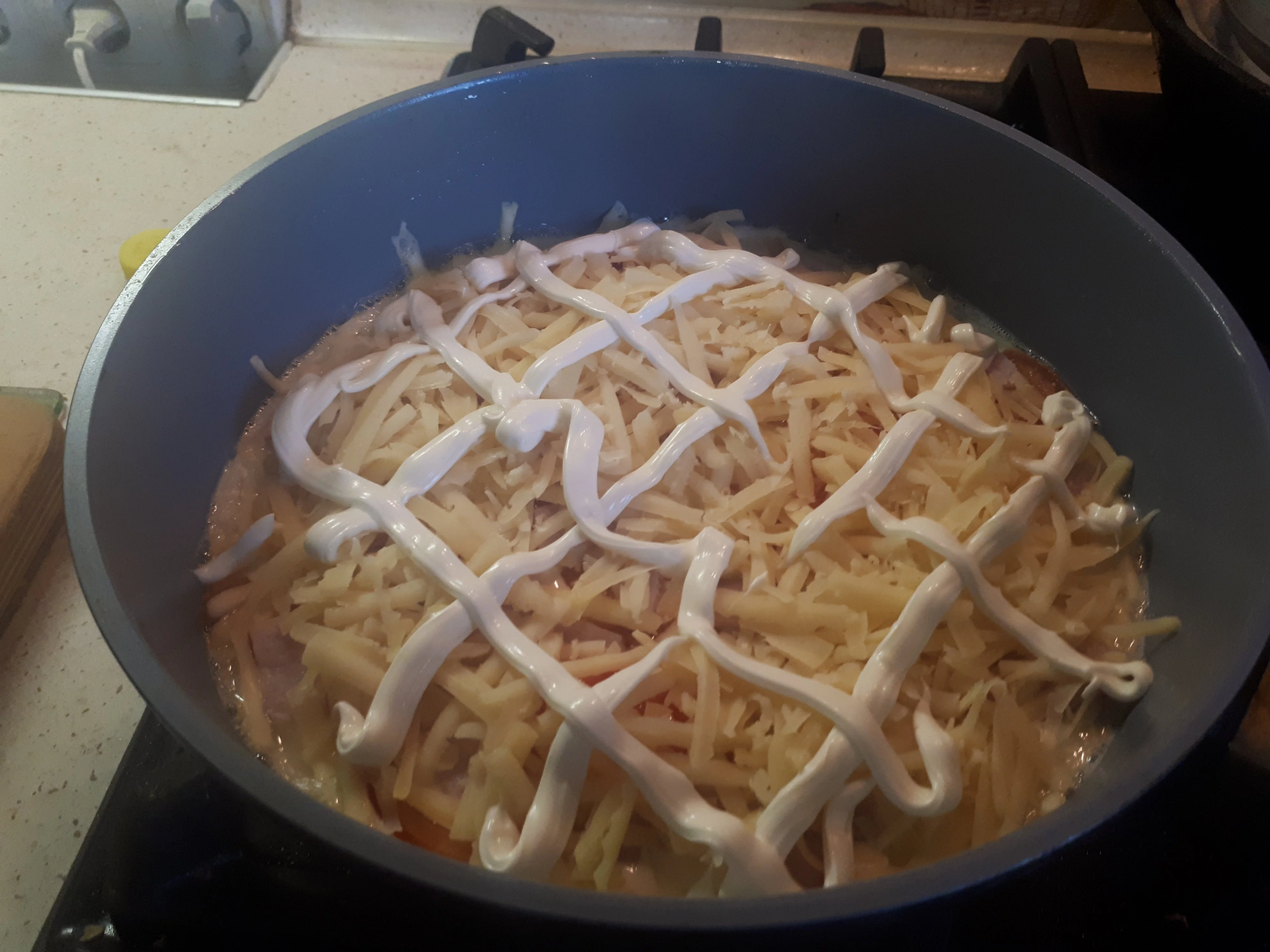 Ставим на средний огонь сковороду, слегка смазываем маслом. Выливаем тесто в сковороду, сверху сразу же выкладываем начинку - помидоры колбаса, ветчина и копченая курица, неважно) верхний слой сыр, промазать еще и сеточкой из майонеза.Готовим примерно 3 минуты без крышки, после чего сбавляем огонь до медленного, накрываем сковороду крышкой и готовим, пока не расплавится сыр. Как только сыр расплавится - пицца готова.