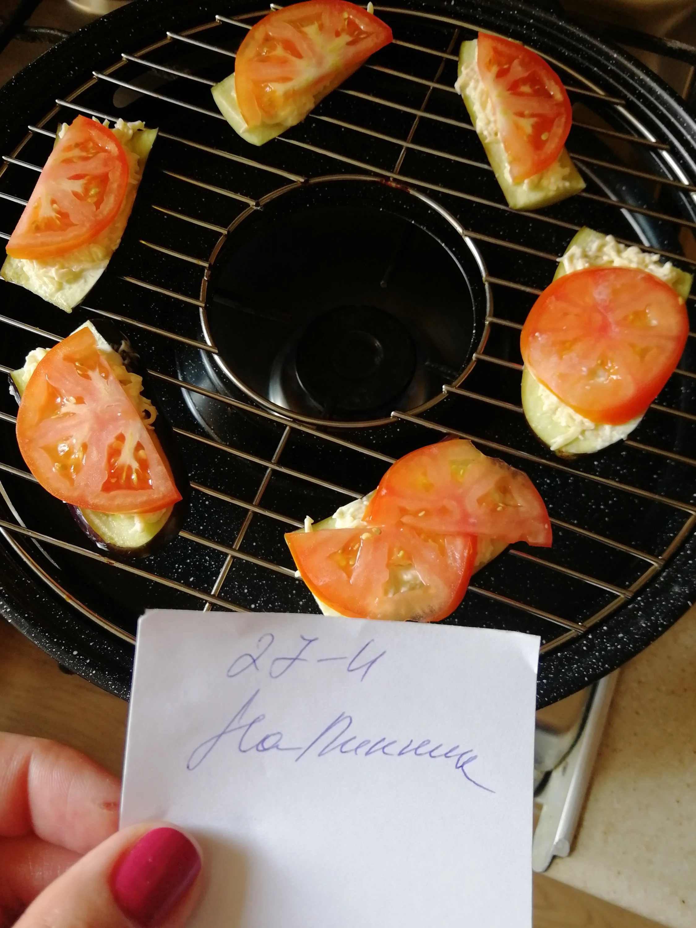 Моем баклажан холодной водой, обсушиваем. Солим, мажем сырную смесь, сверху томат и на сковороду гриль.