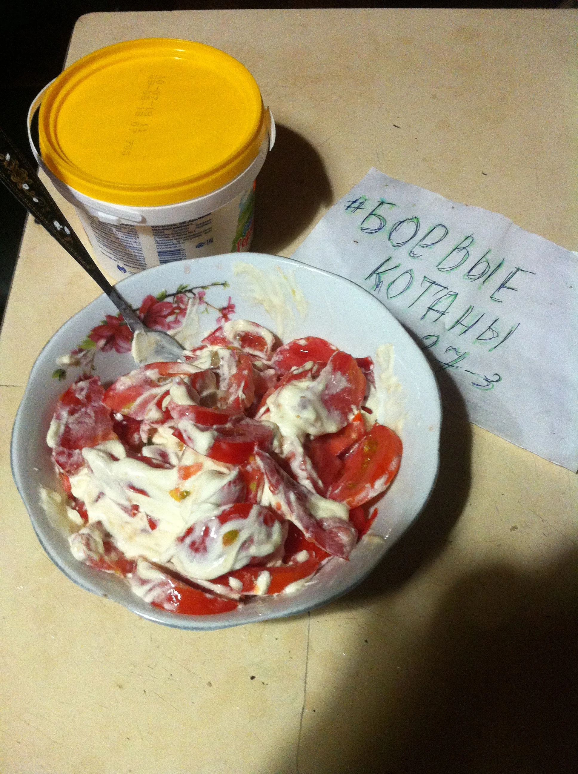 На огороде собираем зрелые томаты)). Порезать их дольками, добавить сметану (не жалеть).