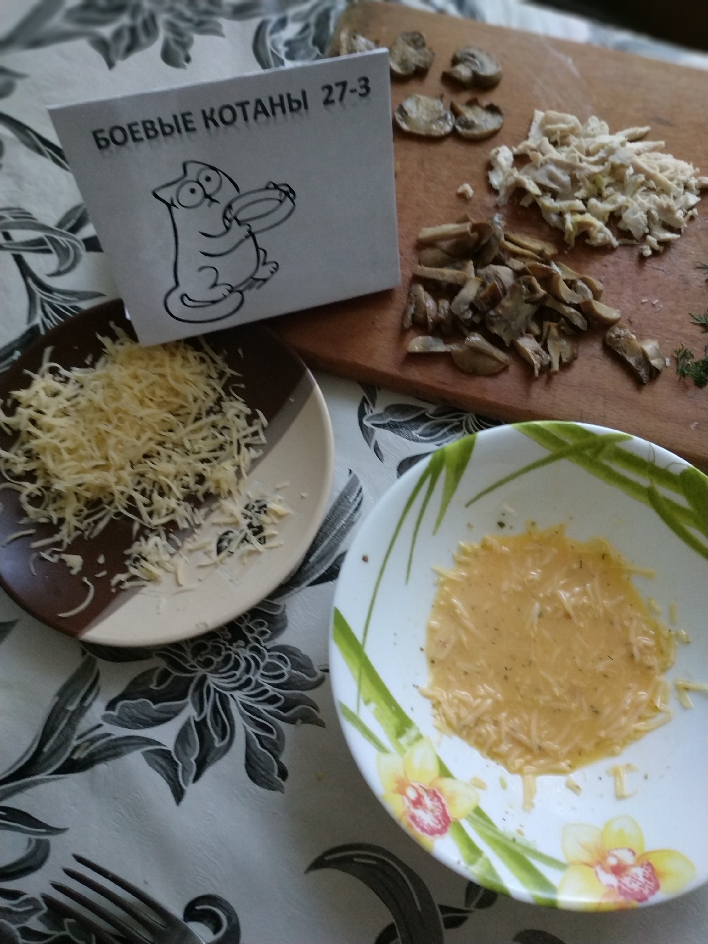 Детям овсяная молочная кашка с клубничным вареньем, коту как обычно сухой корм, себе каша для похудения и мужу яичница в тостах с сыром и зелёным луком.