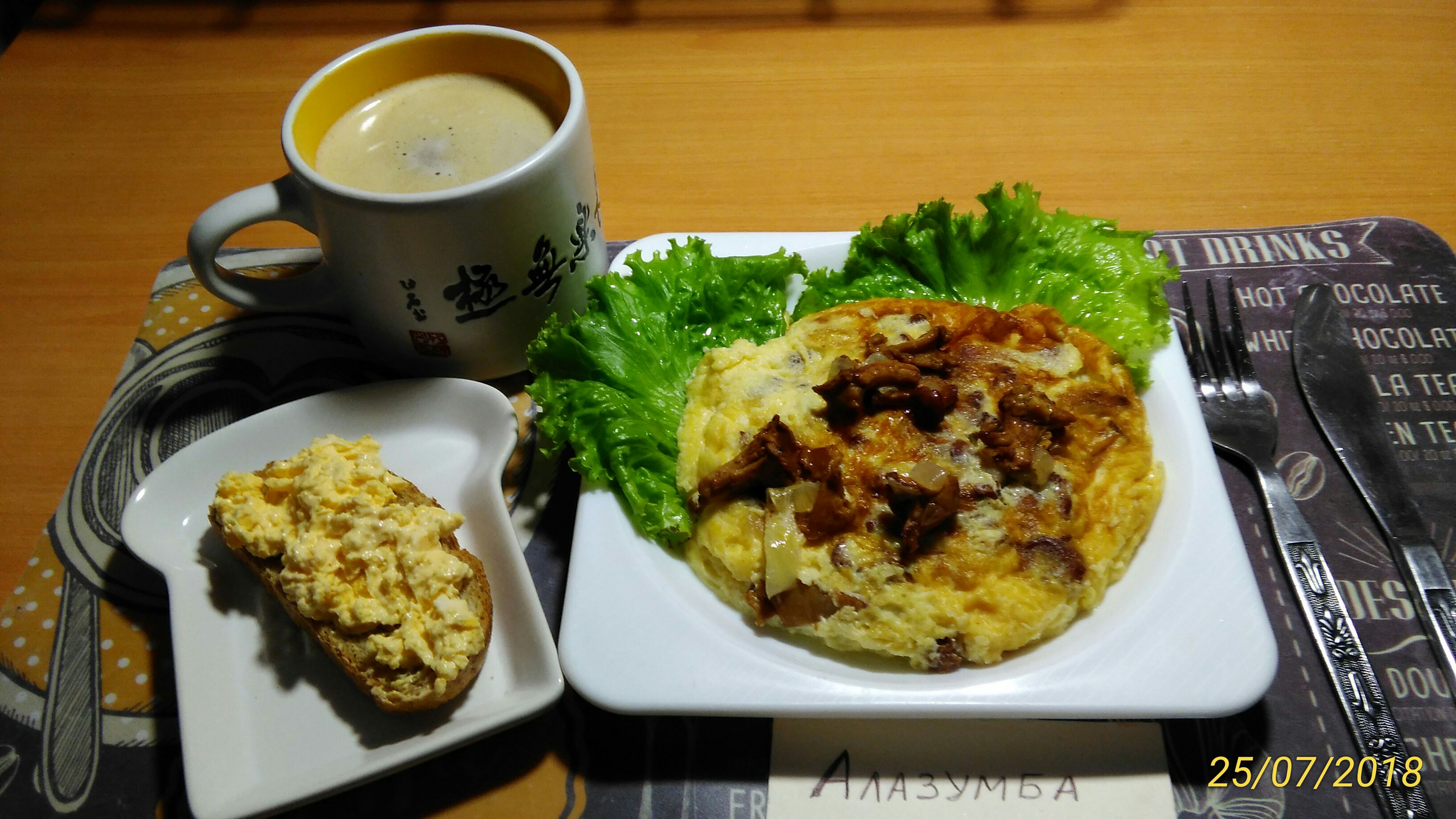 Завтрак: омлет с жареными лисичками, бутерброд из хлеба с отрубями с вареными желтками и плавленым сыром