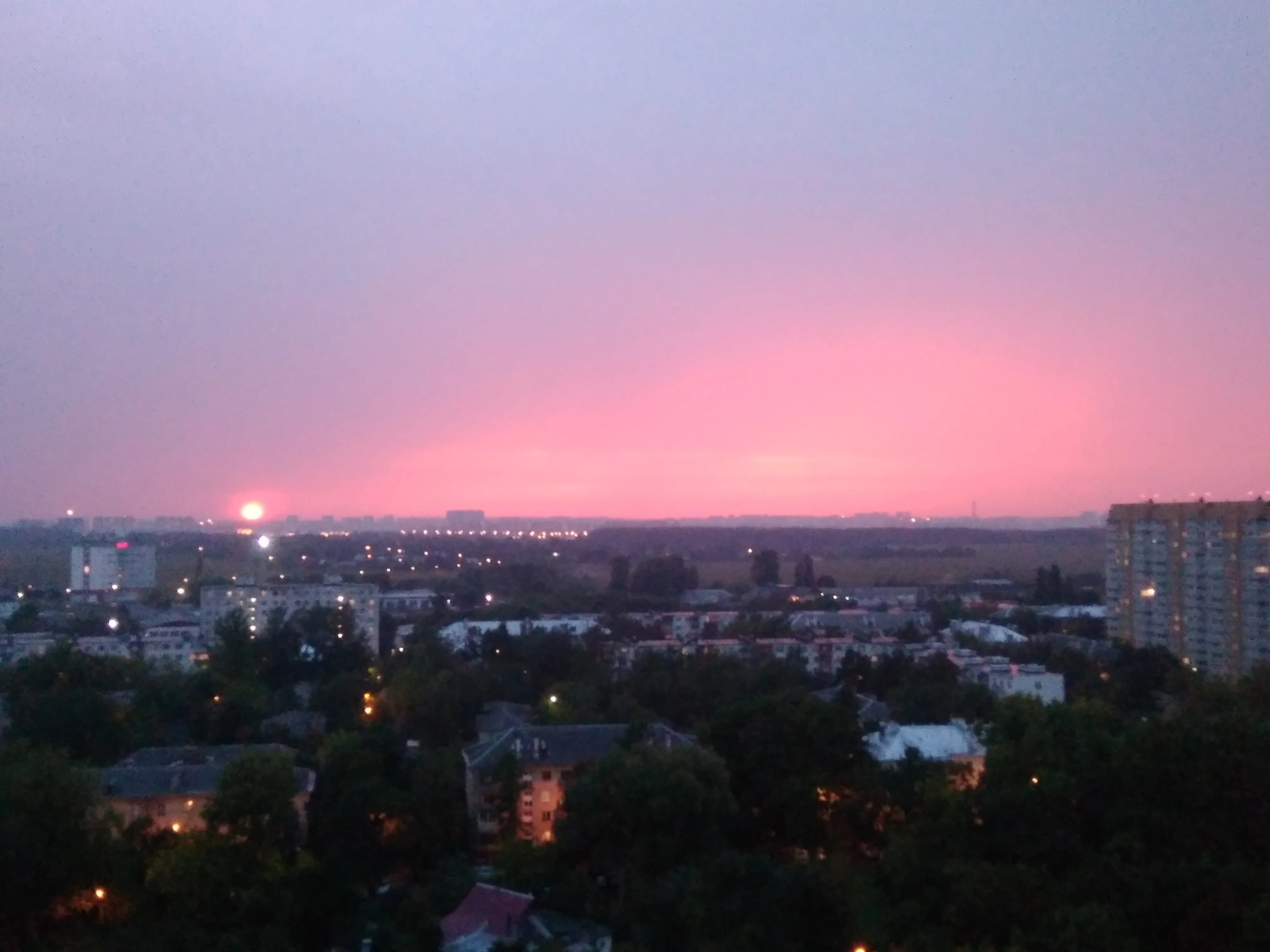Вот такую красоту наблюдала сегодня с 15 этажа. Солнце только красное было, на фотке не получилось.