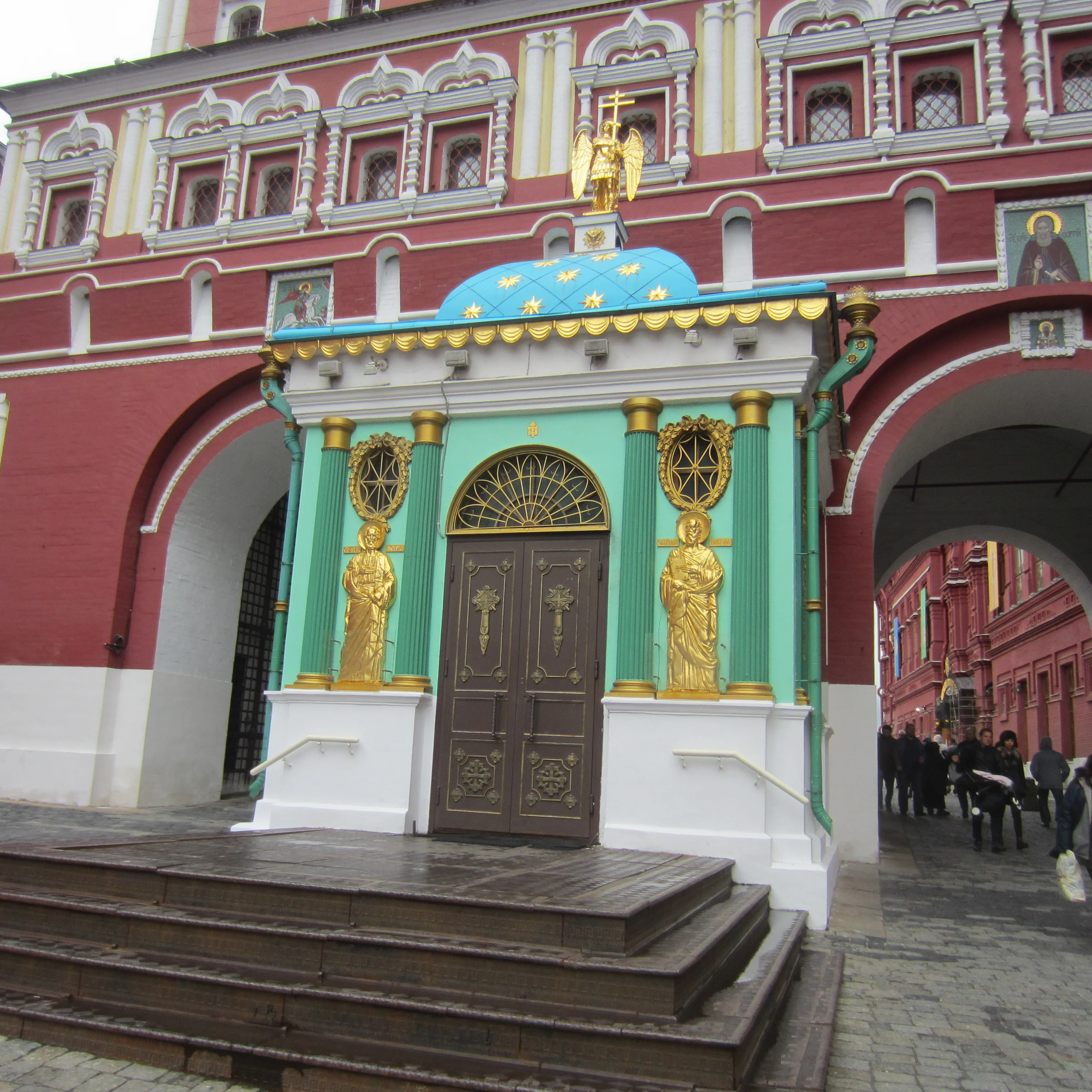 У ворот стоит Часовня Иконы Божией матери Иверская у Воскресенских ворот, очень красивая.