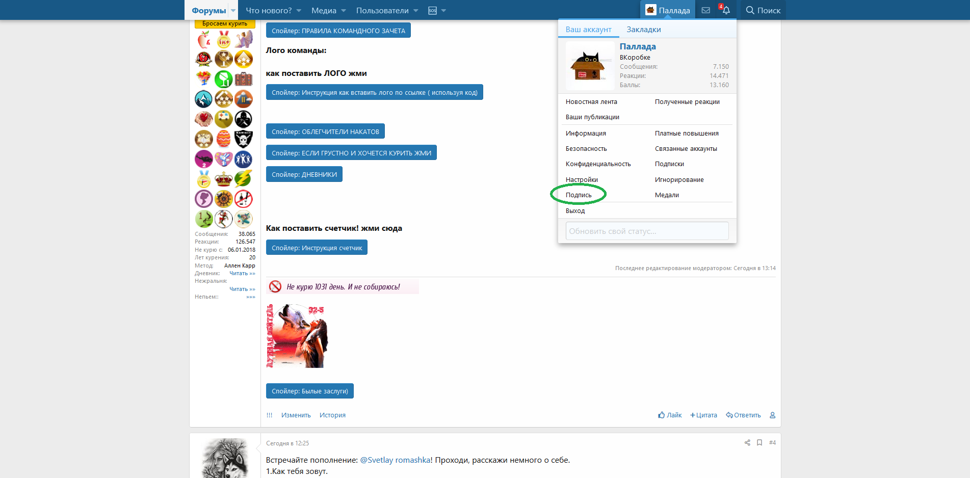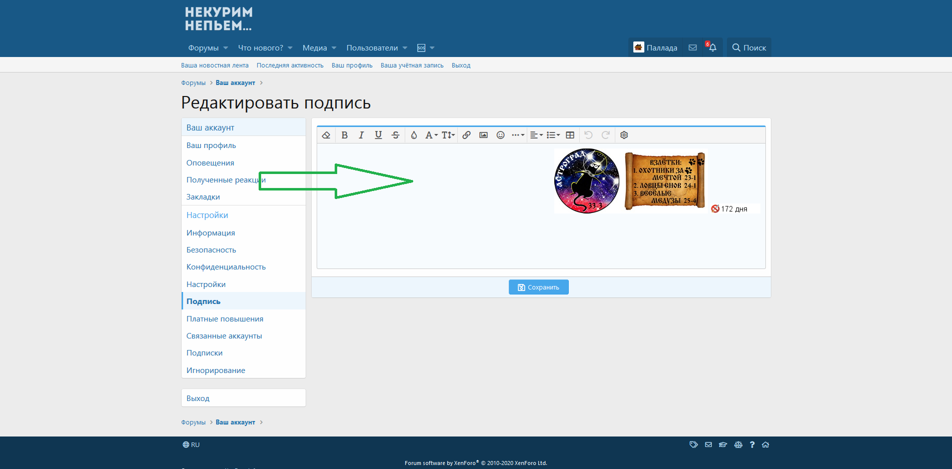 4. В профиле выбираем раздел "Подпись".