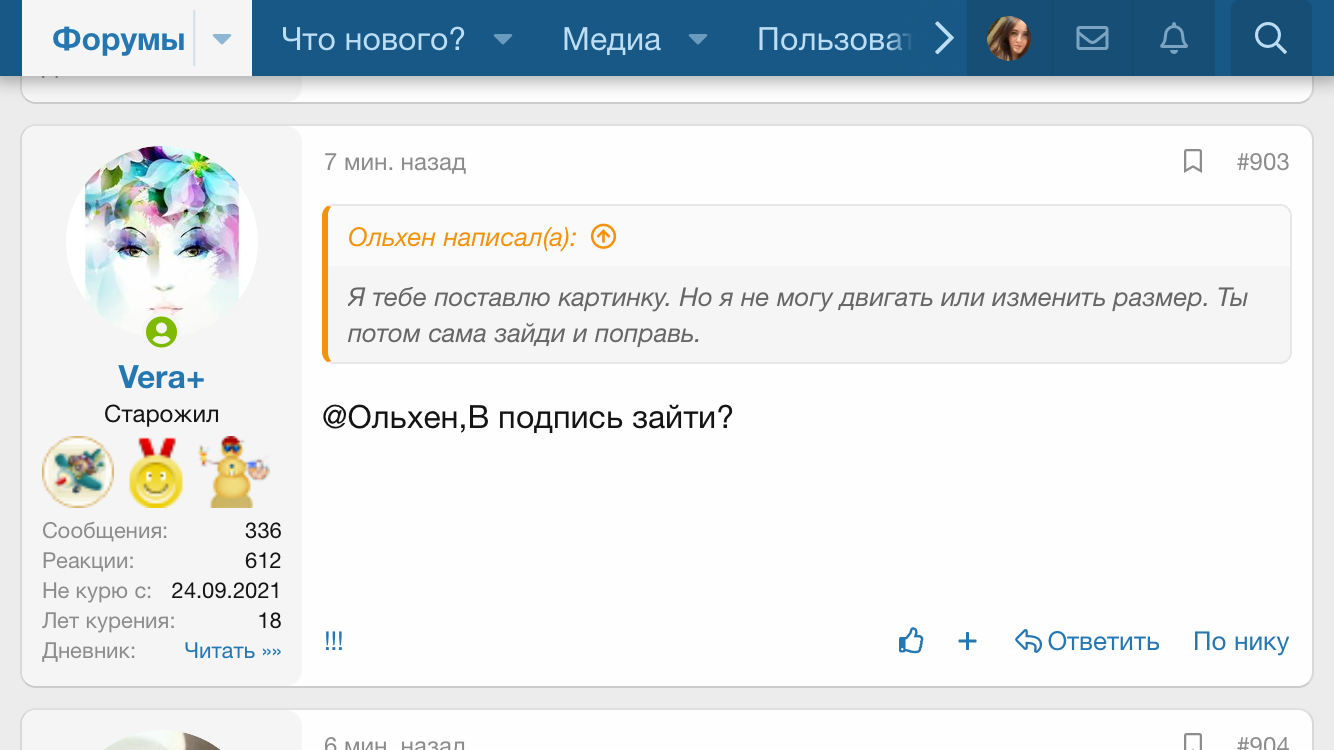 АлоэВера 🧚♀️ V.I.P Сообщения 29.912 Реакции 48.486 Дневник Читать »» Метод Табекс Лет курения 30 Непьем: »»» 26 Окт 2021 #903 Ольхен написал(а): Я тебе поставлю картинку. Но я не могу двигать или изменить размер. Ты потом сама зайди и поправь. Нажмите для раскрытия... @Ольхен,В подпись зайти?