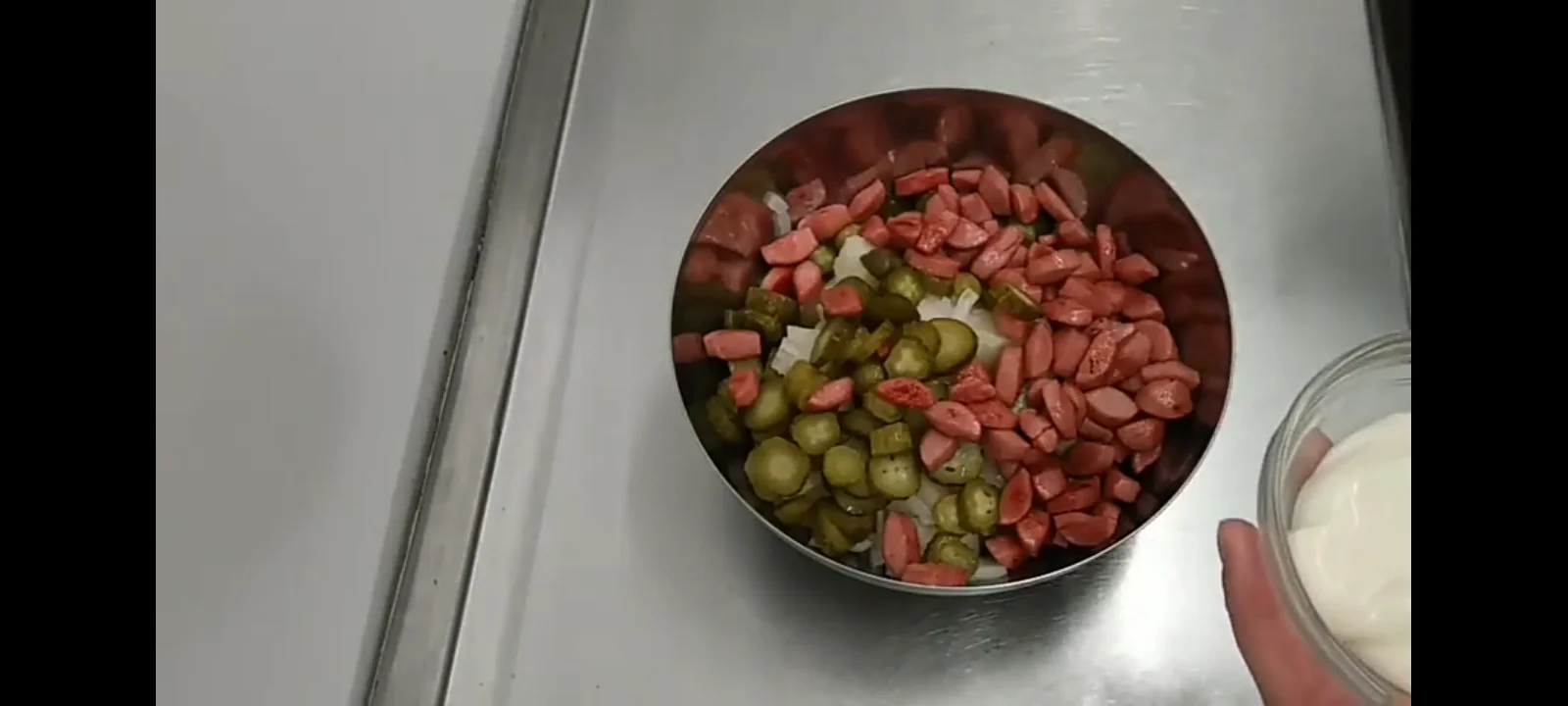 Нам понадобится: сосиски, картошка, лук, маринованные огурчики, майонез