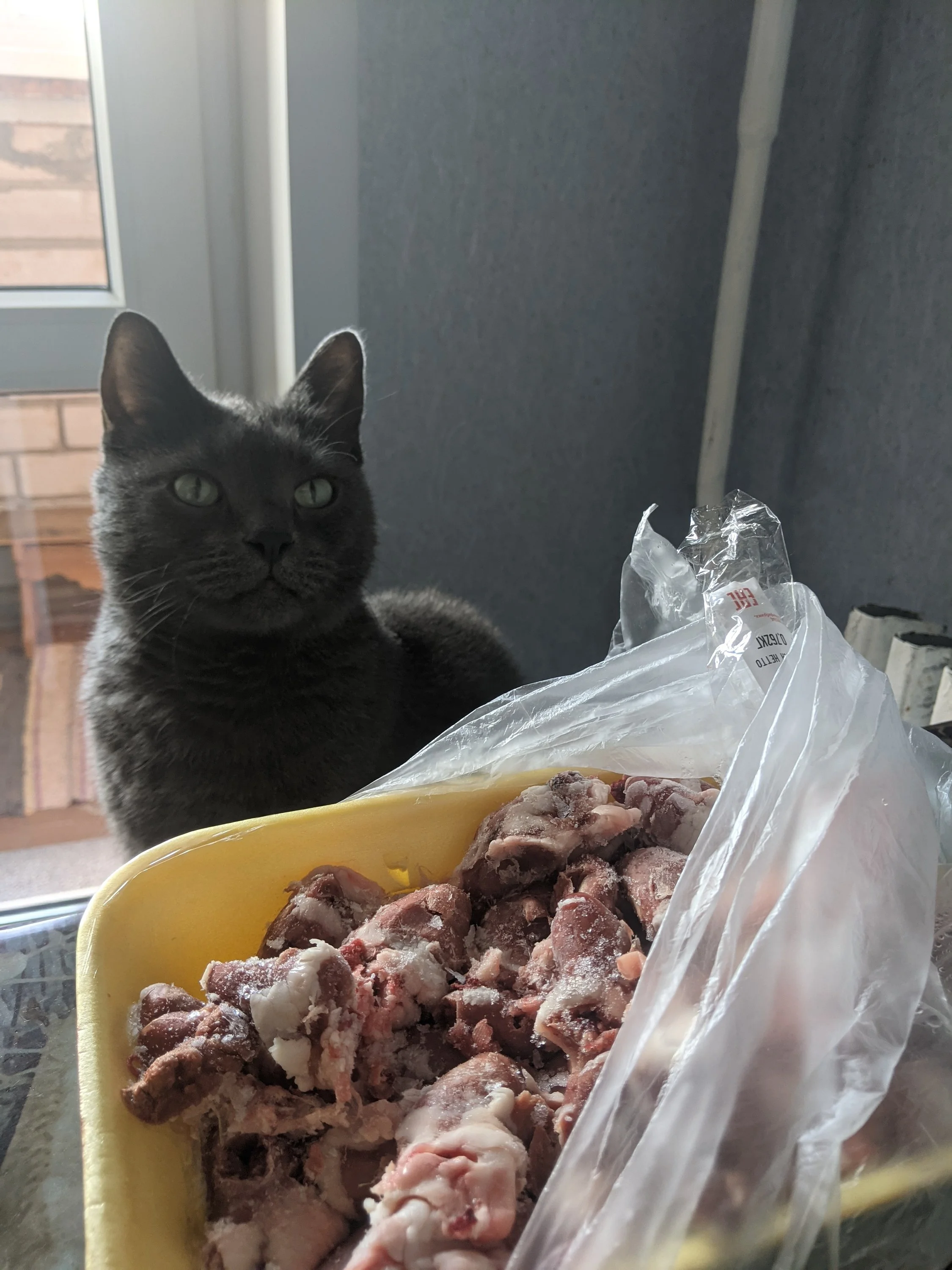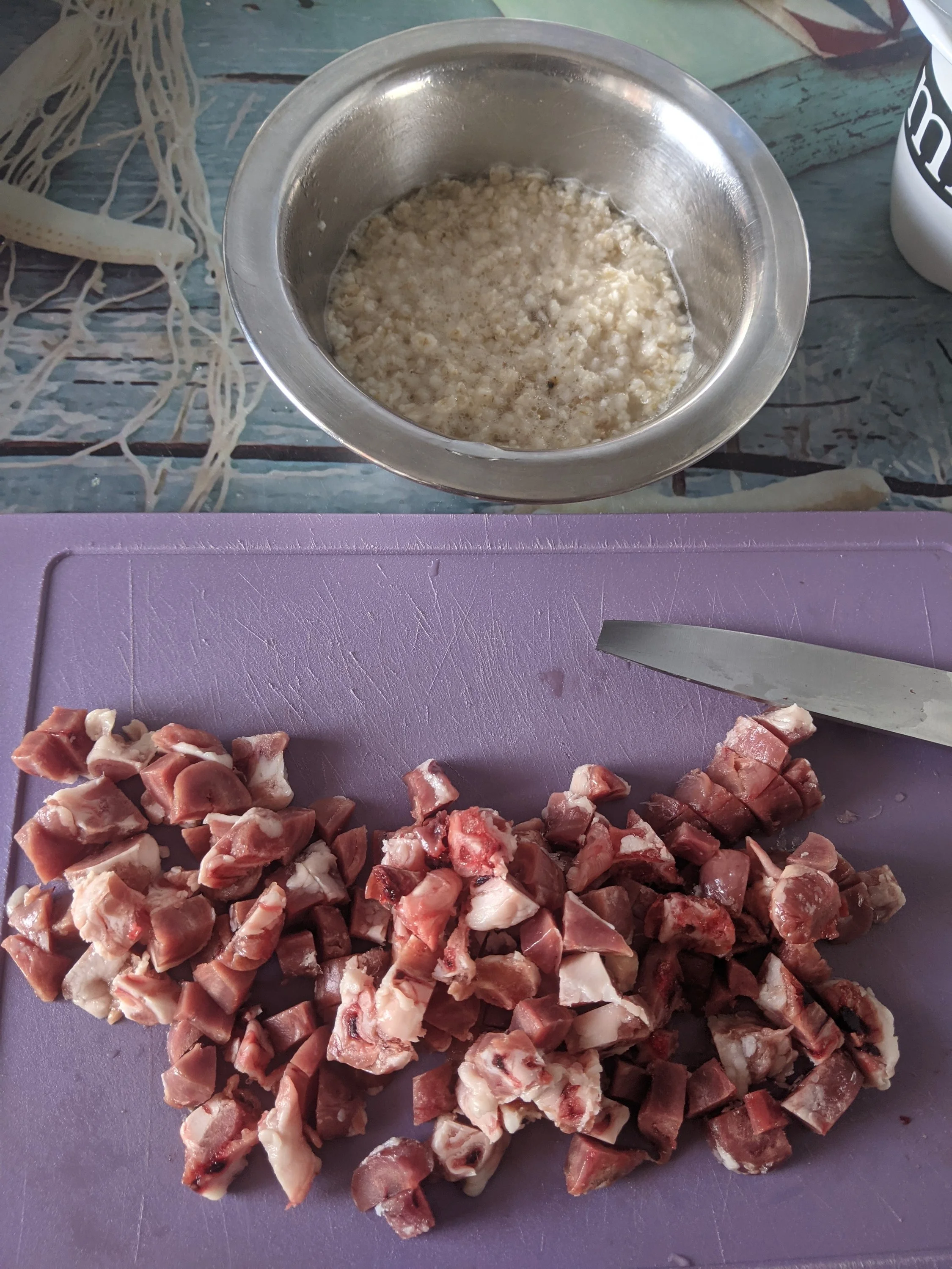 Иногда место сердечек даю грудку, желудочки, бывает говядину или рыбу.