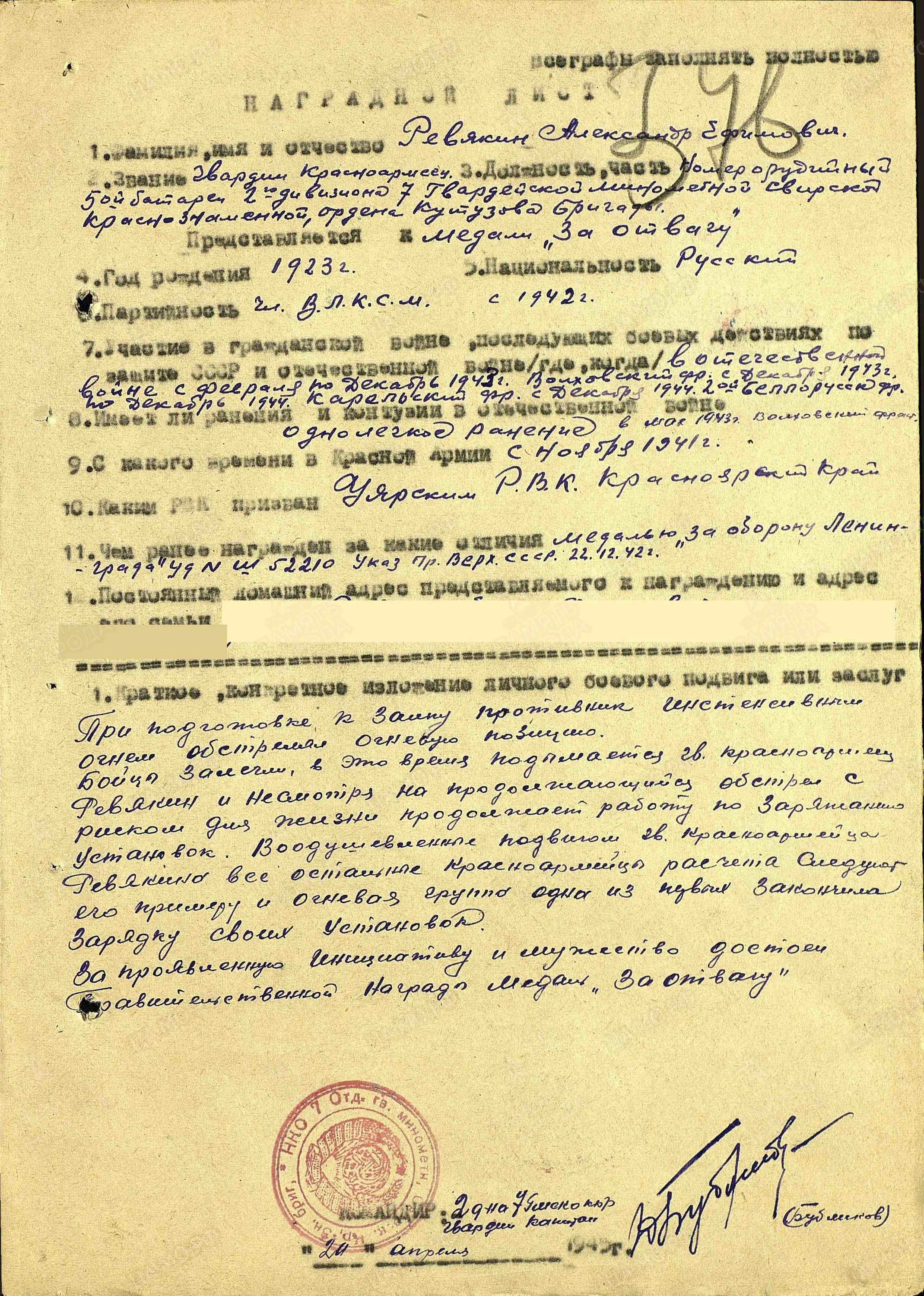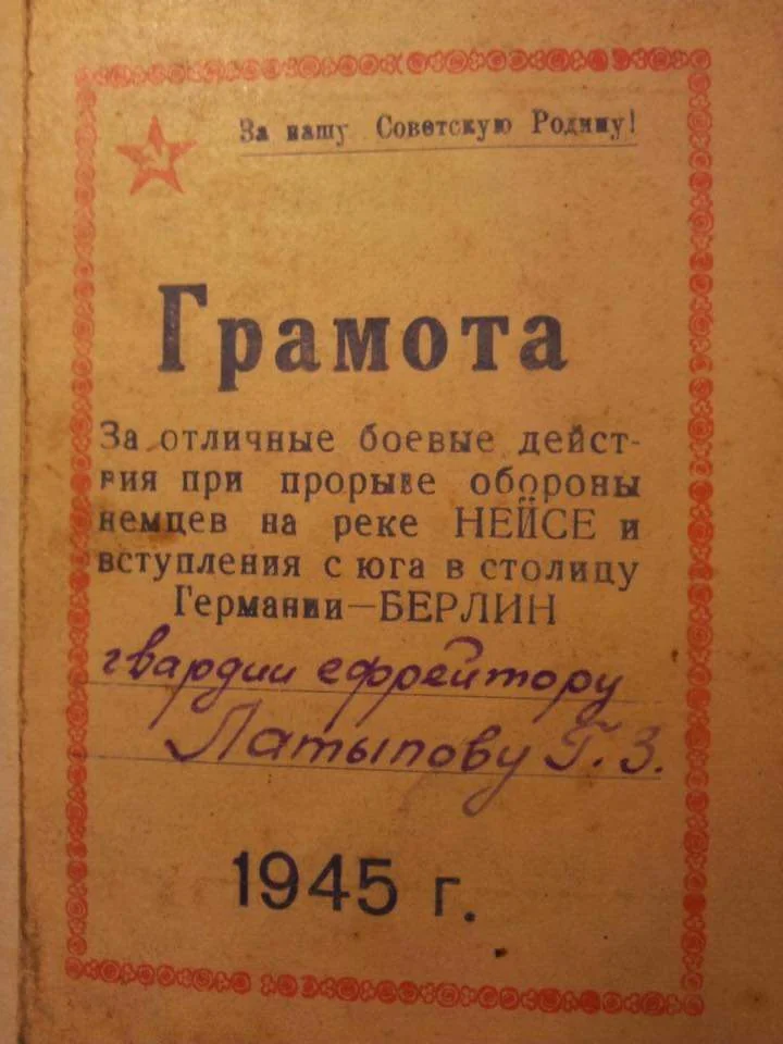 Прадед участник Второй Мировой, был призван 7 сентября 1939, награжден орденом Красной Звезды, назначен командиром отделения( из боевой характеристики от 30.06.1940)