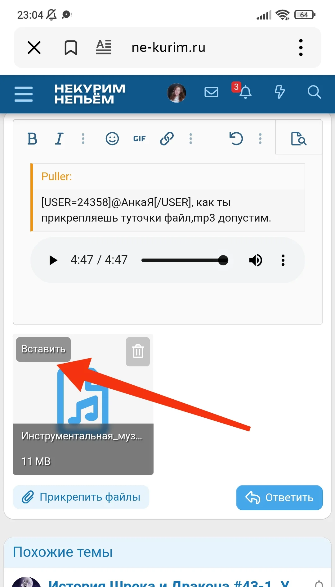 Puller написал(а): @АнкаЯ, как ты прикрепляешь туточки файл,mp3 допустим. Нажмите для раскрытия... Your browser is not able to play this audio. Спойлер