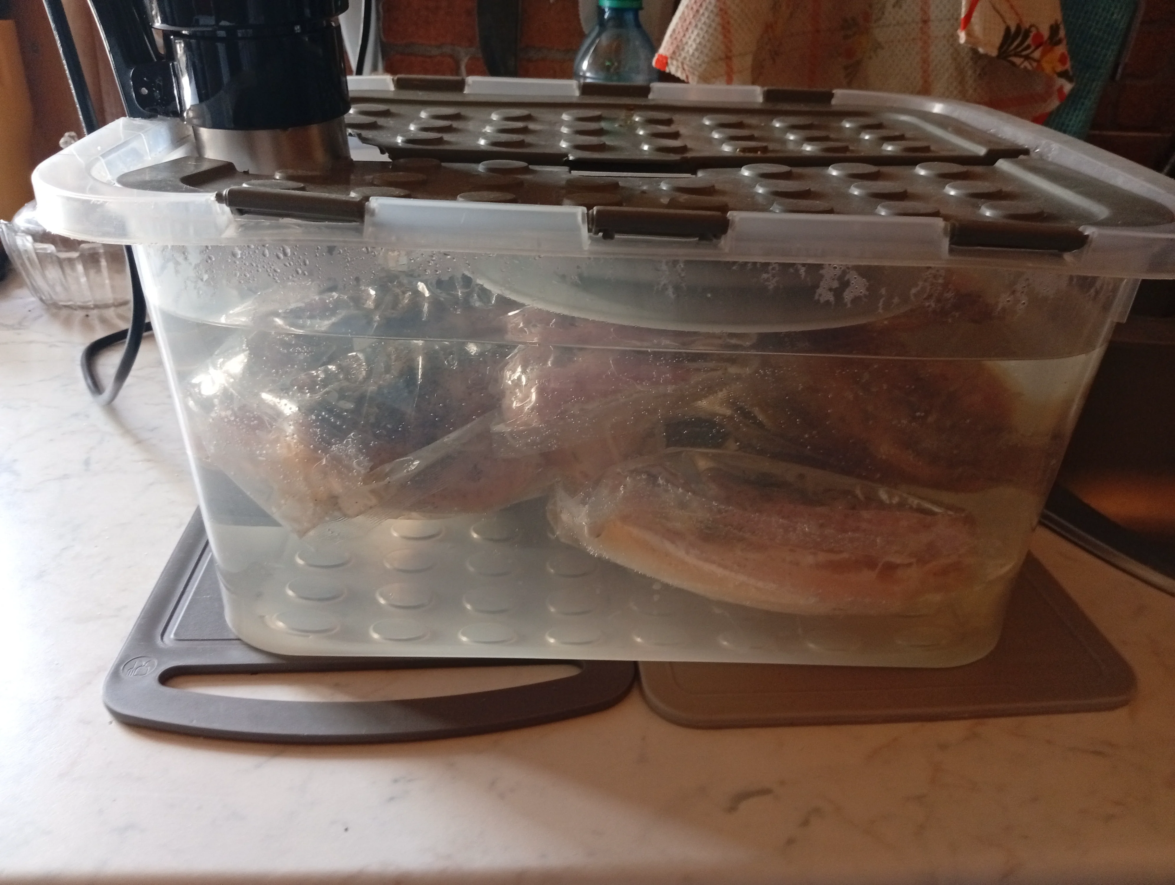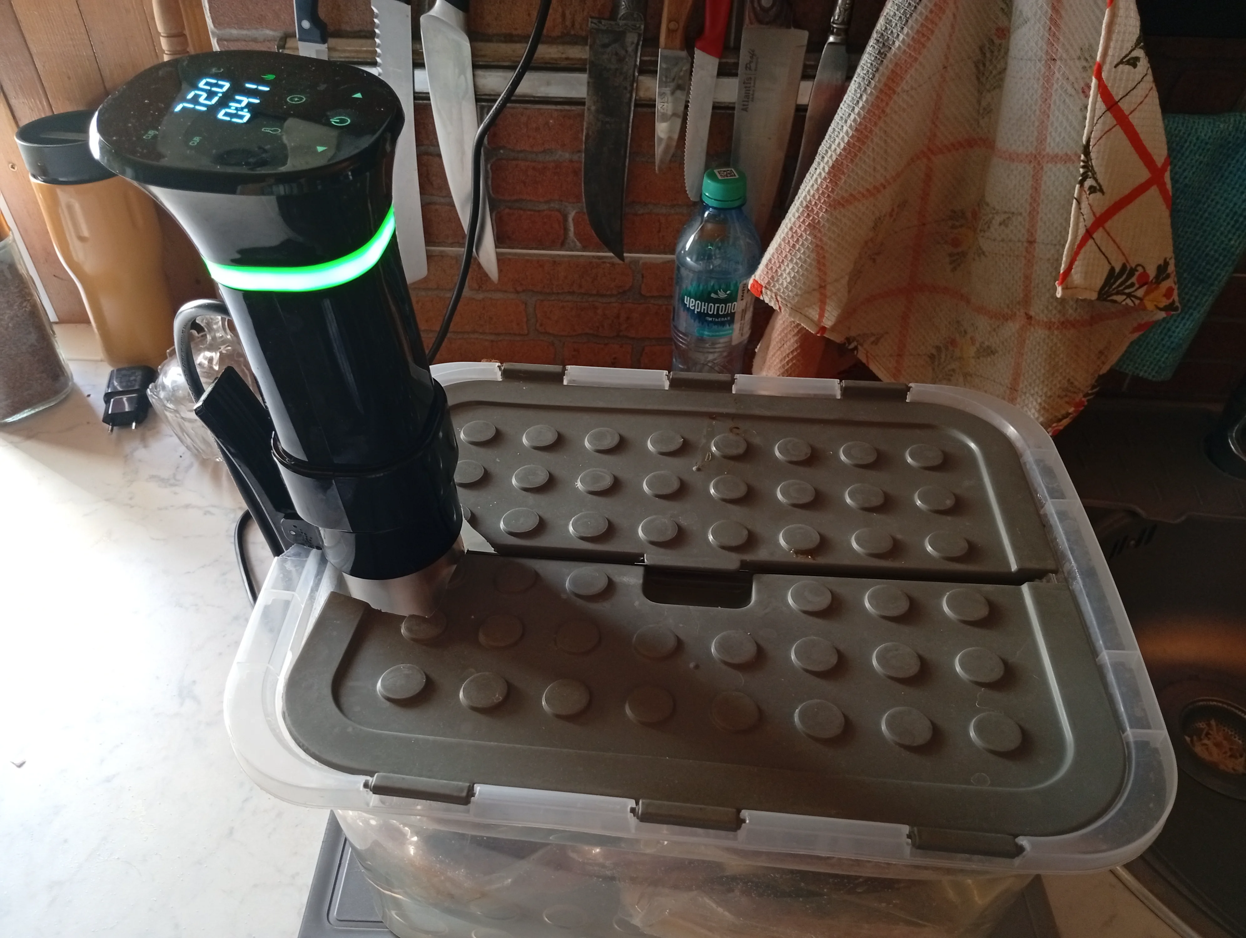 сам кипятильник можно на ВБ купить за 3 тр. Контейнер на 15 или 20 л купить лучше в хозмаге(дешевле выйдет почти в три раза) нужен вакууматор и пакеты к нему разных размеров,так как в сувиде все готовится в вакуумных пакетах. Можно в стрейчпленку пищевую замотать..тыс в5- 7 стартовый набор выйдет