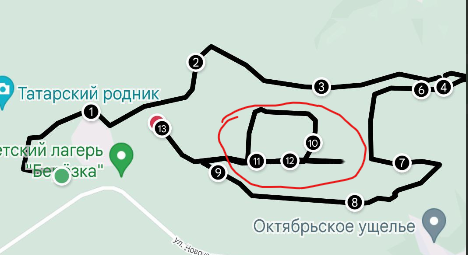 Квадратик в середине (цифры показывают порядок перемещения), это вроде как к финишу бежал (где "Березка"), по прямой (ну почти, там были варианты). Когда понял, что-то идет не так, нашел дорогу - после 12 - вот этот отрезок одинокий вправо от квадрата вообще в противоположную сторону