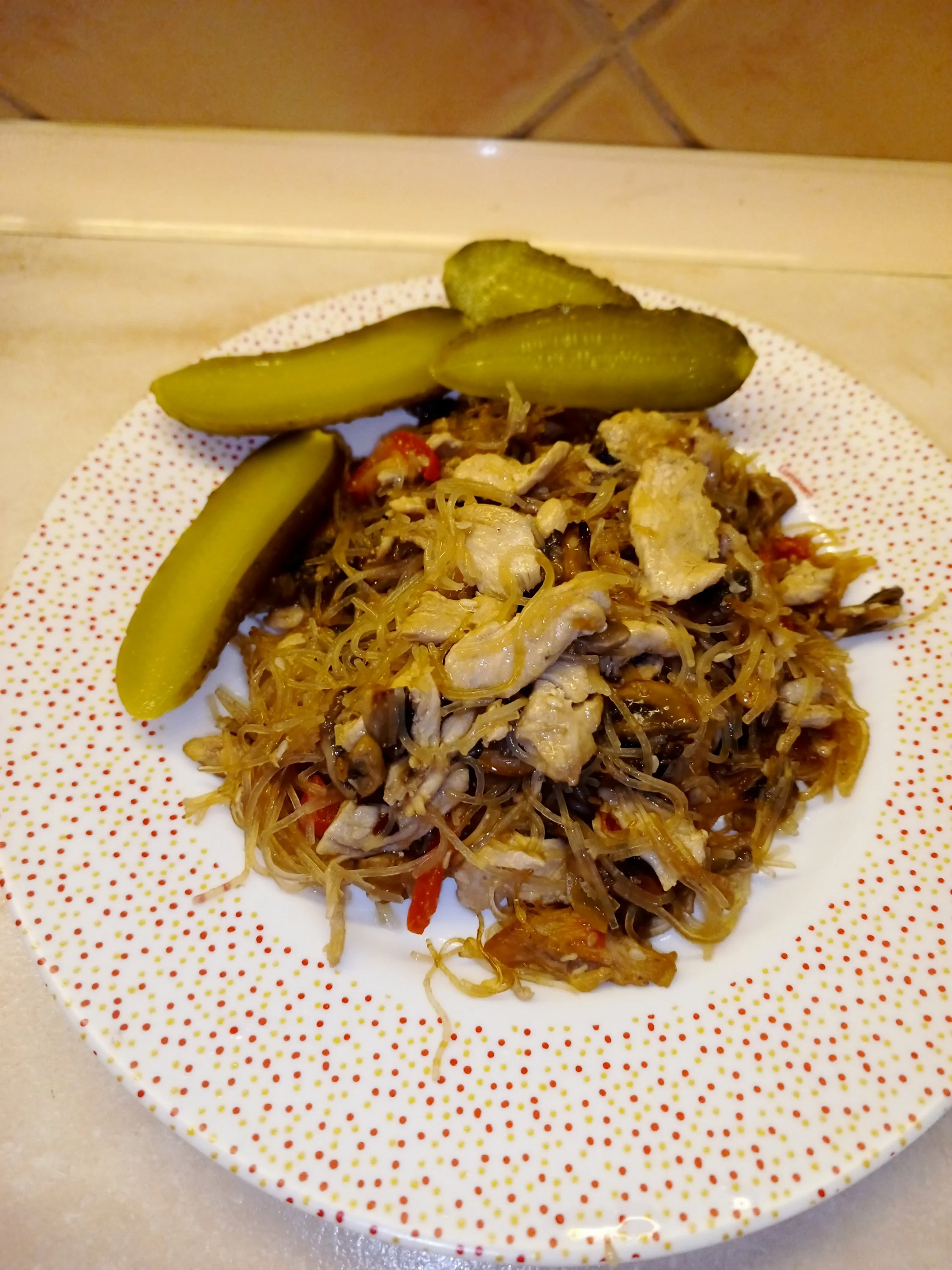 На ужин сегодня фунчоза с курицей, грибами, луом, перцем болгарским и кунжутом. На десерт кисель с баранками) Угощаемся?