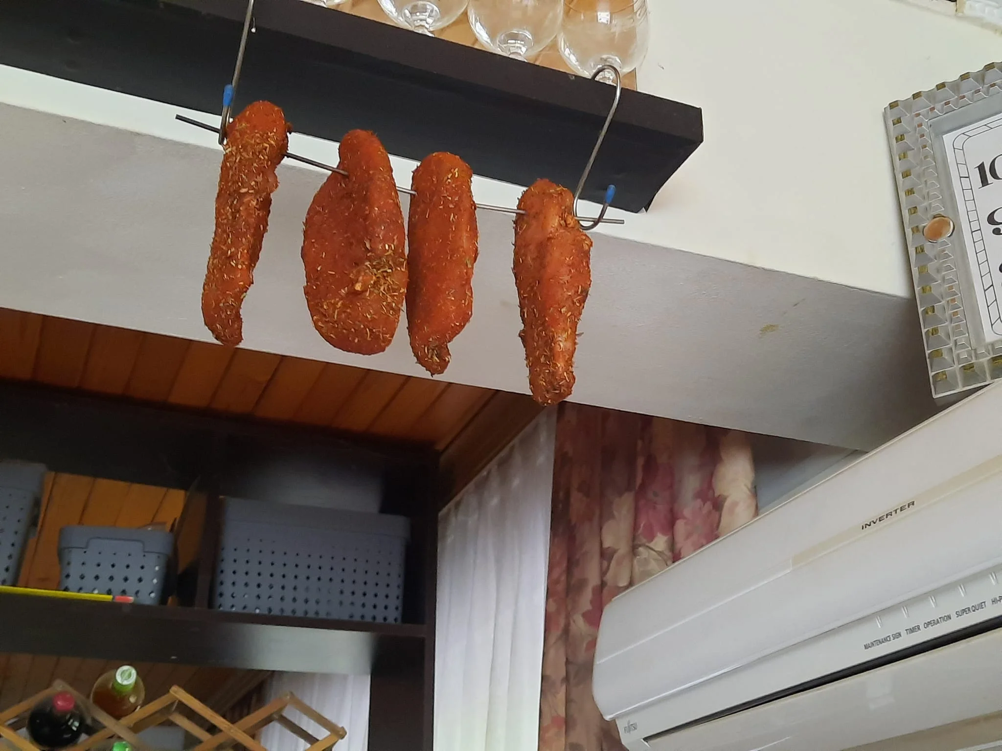 Нанизала на толстую железную спицу и повесила под потолком поближе к кондиционеру. Им нужен прохладный сквознячок, вот кондей его и обеспечивал.