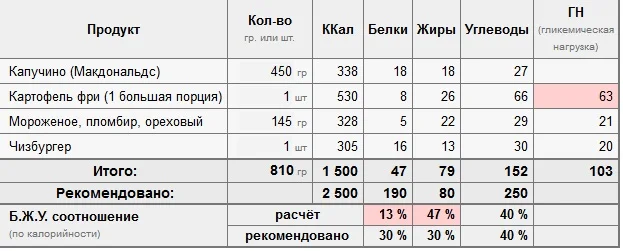 чушь собачья,таких таблиц можно нарисовать сколько угодно и увеличить на фото кого угодно и на сколько угодно)) при современном развитии инета даже спецом для этого быть не надо,но конечно же работники полные и в наше время были,но они уже пришли такие на работу,а не такими стали на работе,да и были их единицы из сотен человек.......в инете щас хлама 95% ,не верьте,это всё происки конкурентов или врагов,завистников всяких......Точно не вредно?! Серьёзно?! Ни грамма лишнего веса, всего лишь говорит о том, что ты не превышал калорийность своего дневного рациона. Разрабатываю в Канаде говоришь ?! в универе-ну ну, вот давай прикинем без телевизеров и хвалёных Канадских гуру, берём стандартную еду из Мака и смотрим, что она содержит: