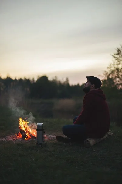 Смотри внимательнее: вон та штука, что у него возле ног - это называется костер, а блестящая в руках - чашка с чаем. Если эти вещи совместить, то получается очень даже тепло))))