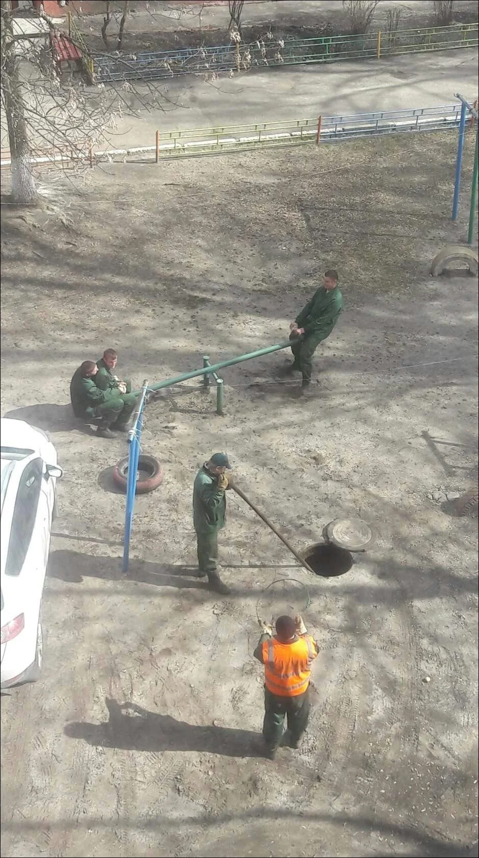 что делает мужик по центру? через трубу отходы отсасывает, как бензин?)