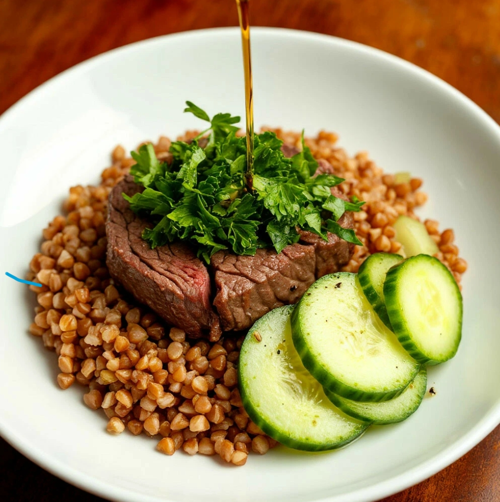 Отварная гречка с небольшим кусочком отваренной говядины и свежий огуречный салат с каплей яблочного уксусаПосмотреть вложение 2179625