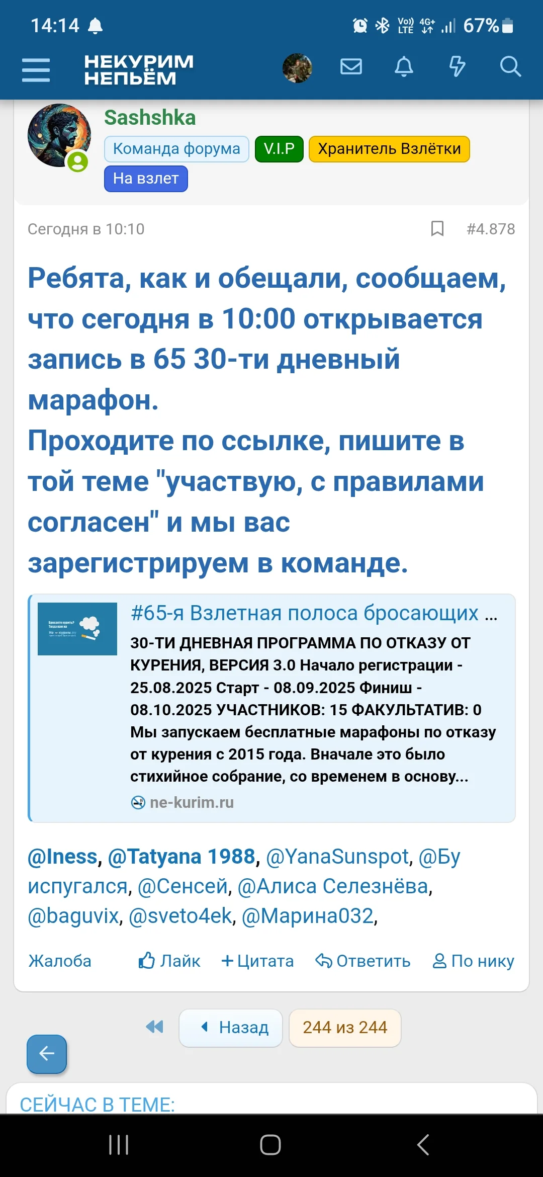 Привет! @V1tysha . Мы записали тебя в тридцатидневный марафон по отказу от курения, твоя команда № 1 За время марафона ты сможешь познакомиться с материалами основателя форума, аналитического психолога Сергея Князева, найти новых друзей, поддержку и конечно же отказаться от курения. Проходи по ССЫЛКЕ, в команде тебя встретит наставник и ответит на все интересующие вопросы.