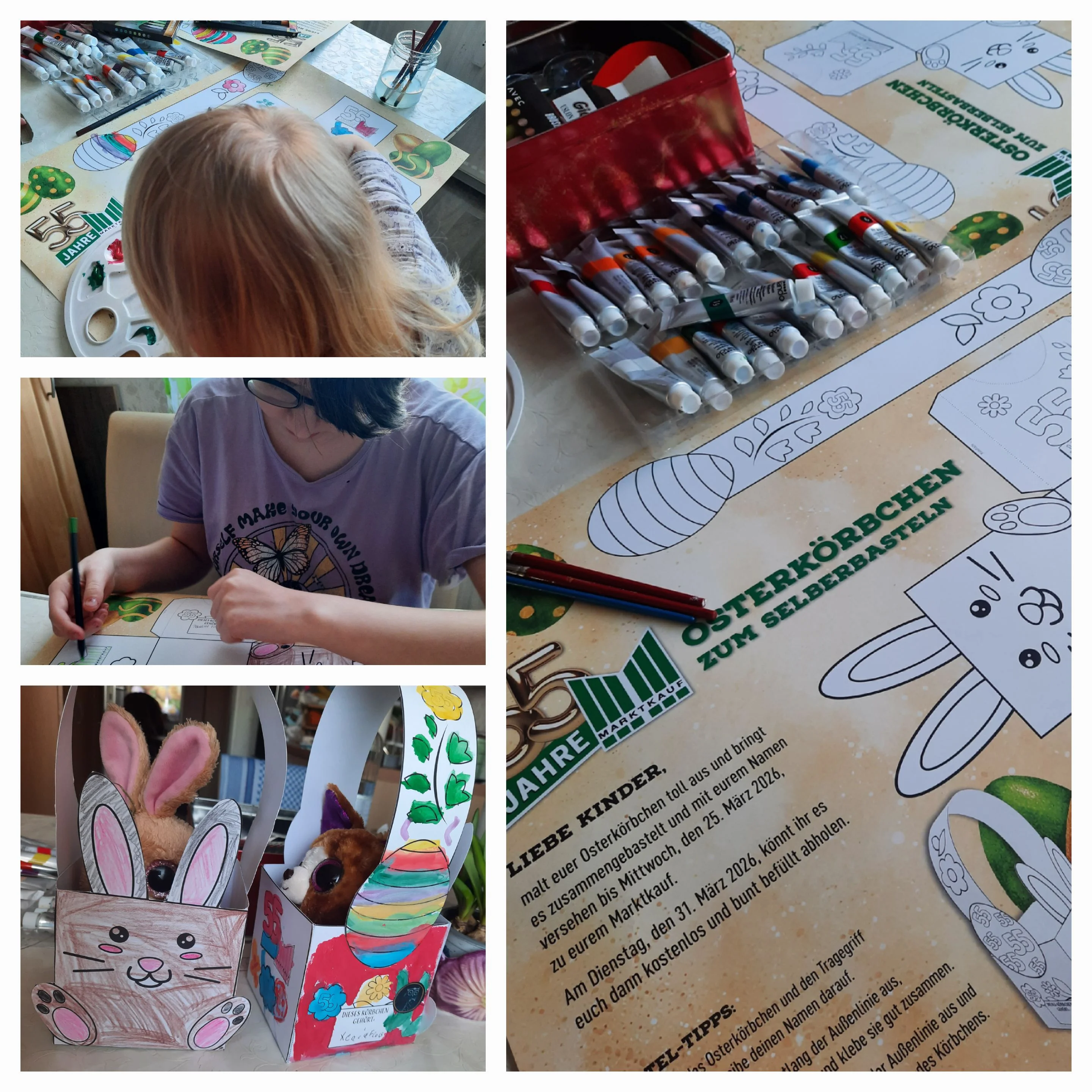 В магазине у нас проводится акция, нужно было раскрасить и склеить корзинку для пасхальных подарков, отнести в магазин и на следующей неделе забрать корзинку с подарком. Девочки старались)