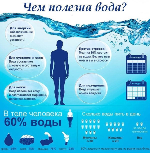 Вода помогает нашим внутренним органам работать эффективно, избавляет тело от всех видов токсинов, освобождает жировые запасы. Из-за спортивных диет с высоким содержанием белка, а также постоянных тренировок, во время которых теряется очень много жидкости, организм человека склонен к обезвоживанию. Поэтому воду нужно употреблять в больших количествах.