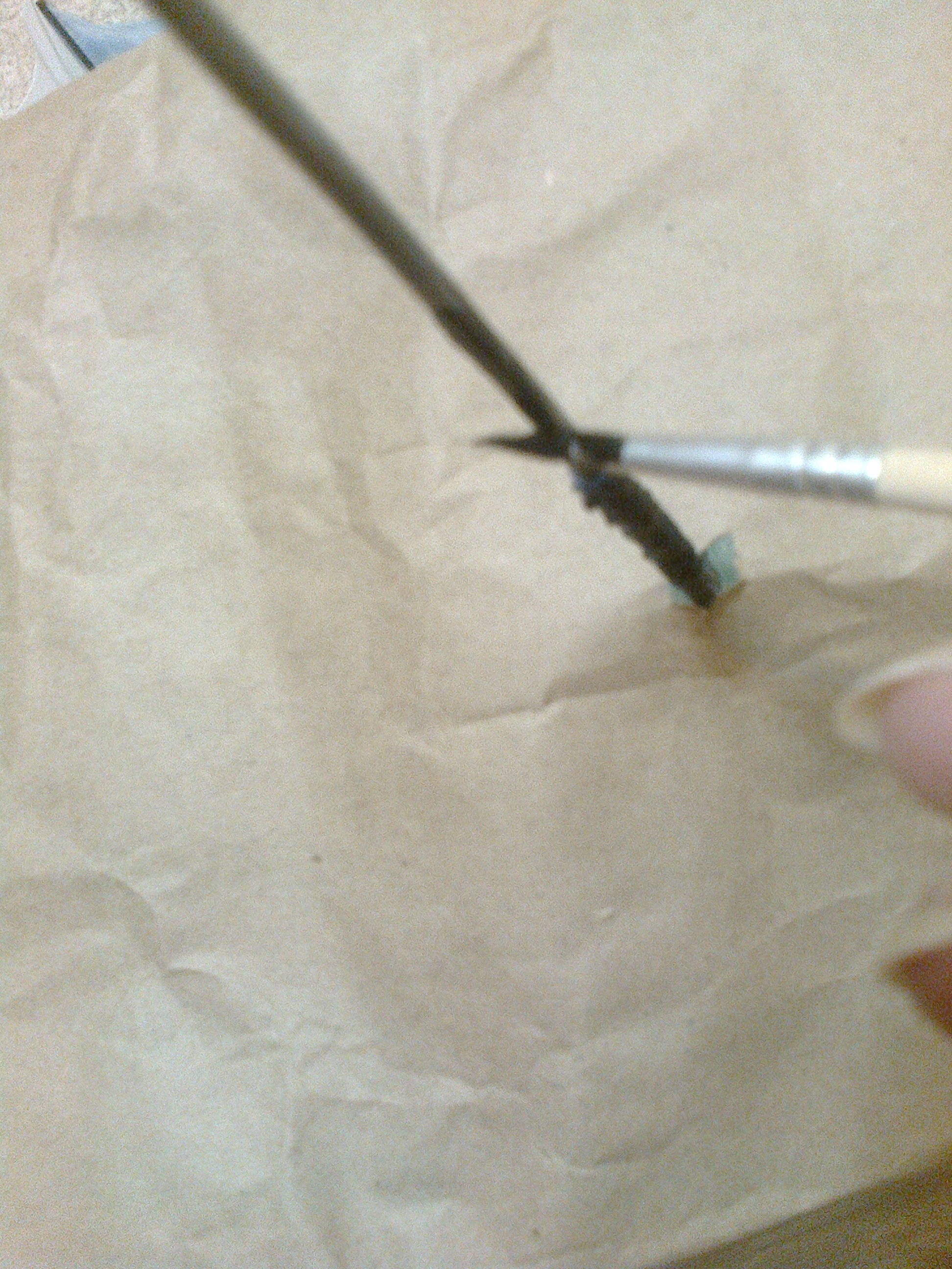 Подруга сломала зонт, спицу потеряла. Зная, что у нас с мужем руки растут из правильного места, принесла зонт нам, он ей почему-то дорог. Муж сделал спицу. Дополнительно зафиксировали капроном. Крашу в тон остальным. Пришью. Муж принесет еще одну притычку (на работу брал как образец). Поэтому закончим в среду. Сейчас вот так.