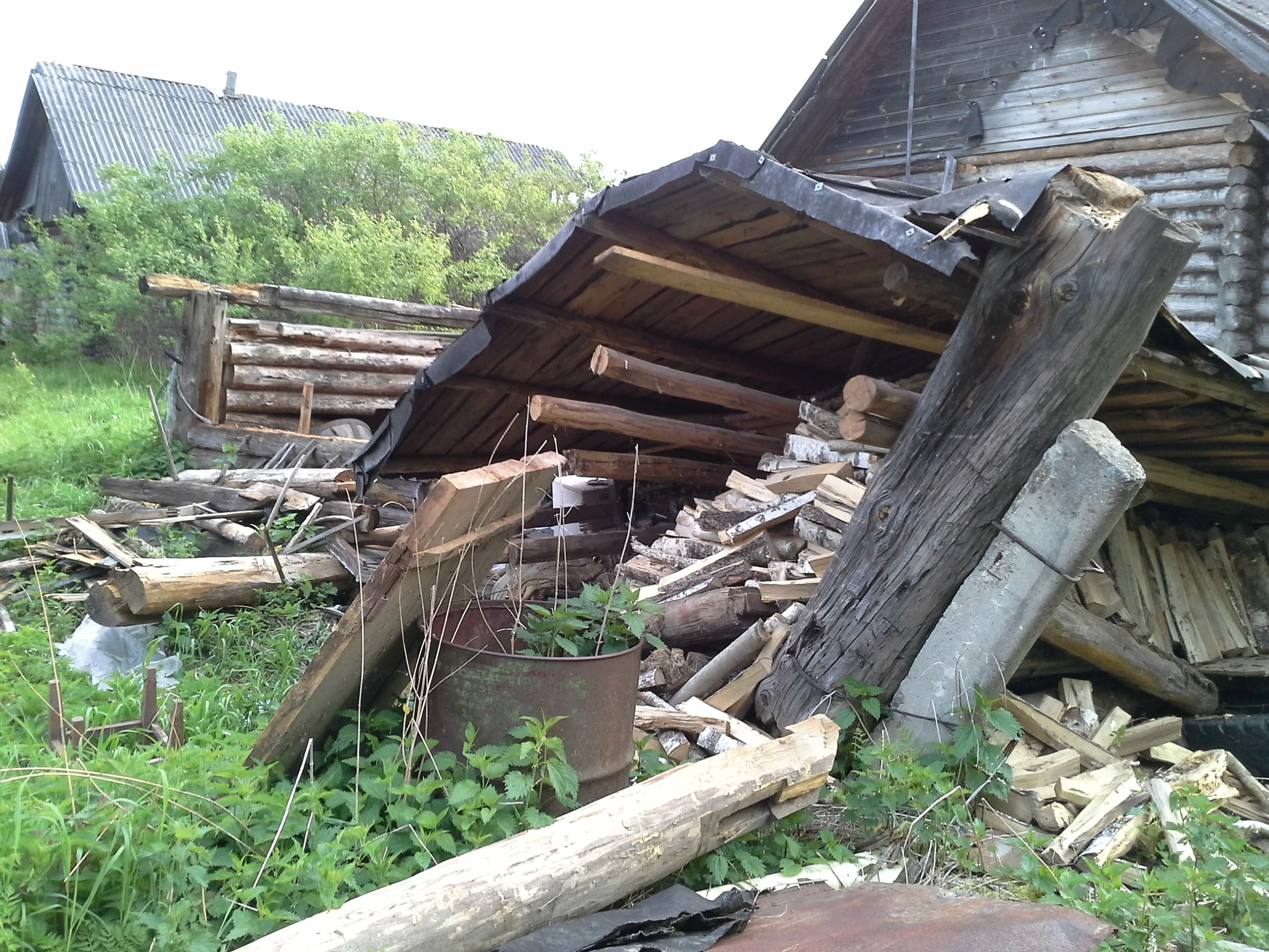 У нас еще впереди развалившийся двор разобрать, че нить под хозинвентарь пристроить и типа открытой веранды хочу еще ченить. Вот это было нашим двором. Хорошо дрова под крышей!:D