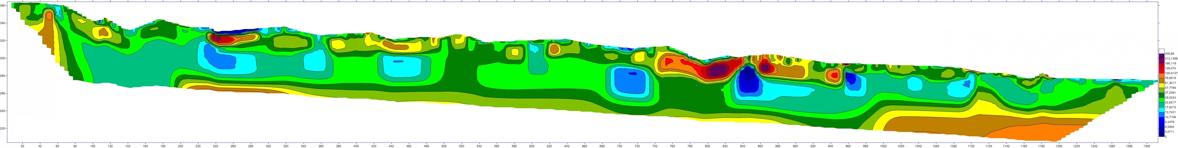 там, если очень грубо - глубина равна пятой части длины. То есть если стандартная расстановка 250 метров, то глубина будет 50 метров. Здесь больше километра, но мерил все равно кусками по 250, один за одним, потому один хуй 250 расстановка и 50 глубина. Но это по ровной поверхности, а тут надо еще поправку на рельеф делать. Кароче, математика. Благо считает комп, а не я.