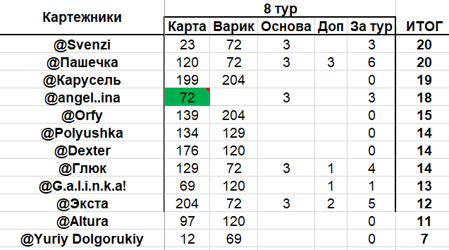 Итоги 8 тура, в котором снова сменились лидеры, ну а Йурий топором пошел на дно![]()