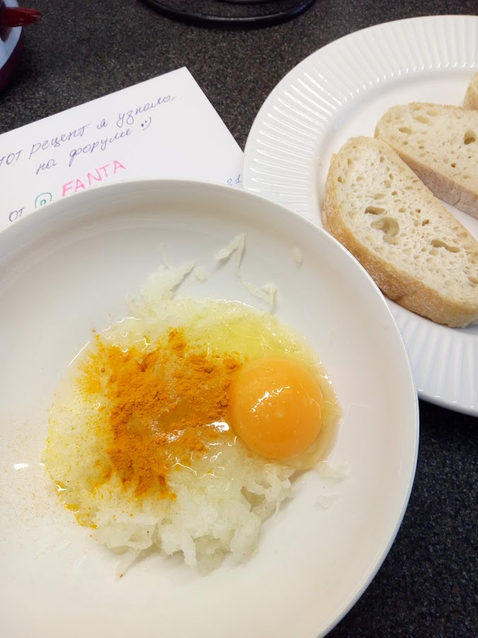 Лук я натёрла на крупной тёрке, так кусочки меньше и совсем одинаковые, яйцо, соль и куркума: