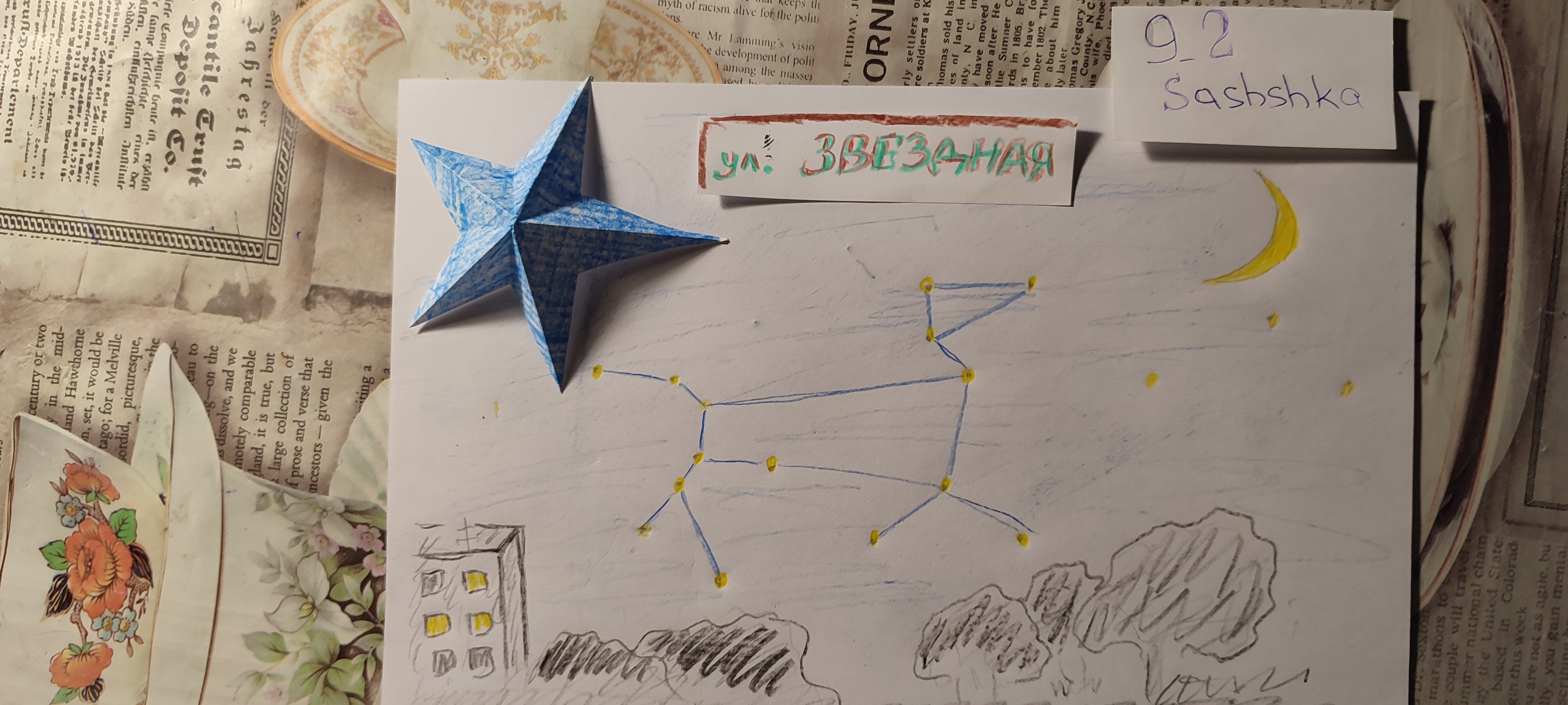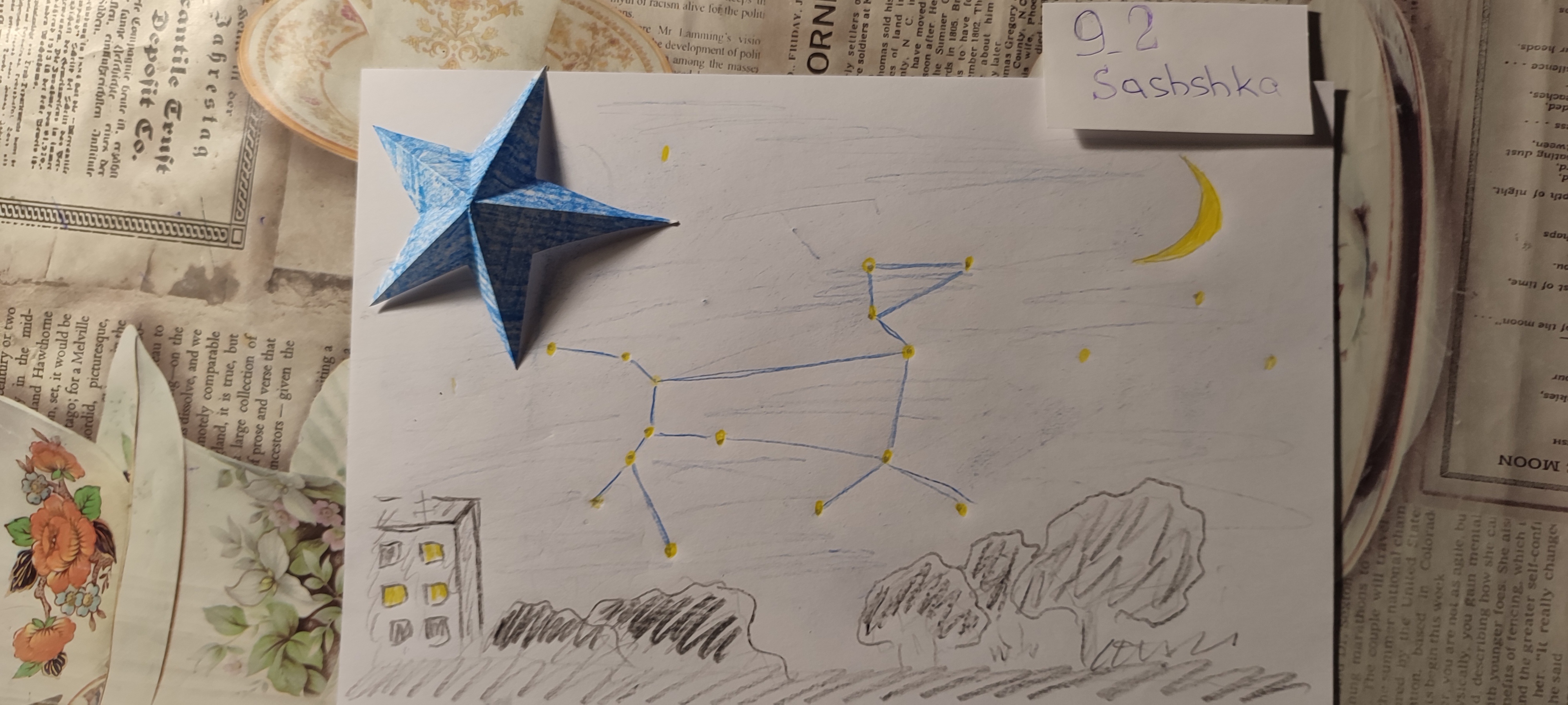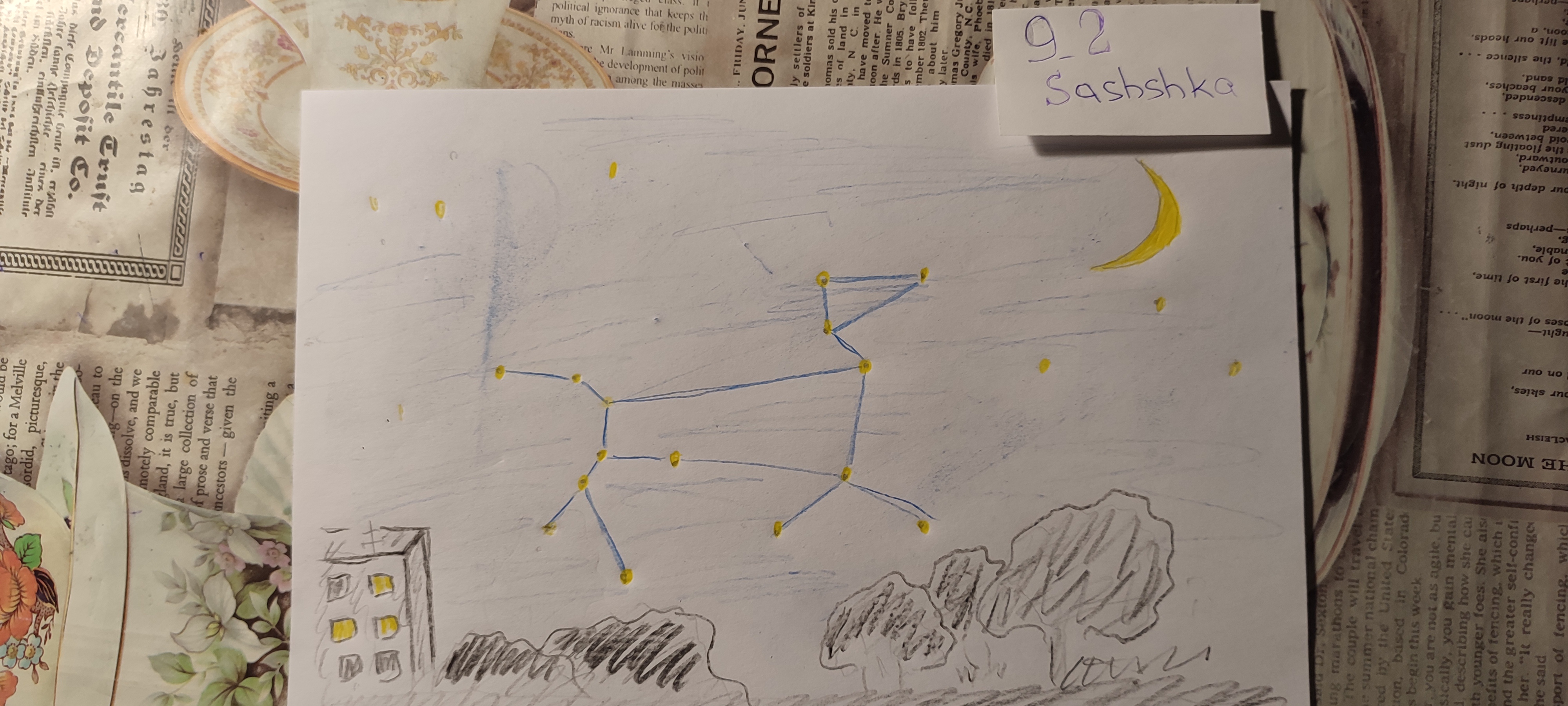 Я сидела одна в своей комнате и рассматривала созвездия. Я люблю смотреть на звезды. В детстве папа подарил мне желтый атлас «Мир и человек». Самый интересный раздел там был для меня первый – строение солнечной системы. С тех пор я честно пыталась найти глазами на небе изображенные там созвездия. Но находилась в основном Большая медведица. Иногда- малая. Еще мне с детства хотелось иметь телескоп. Вот тогда бы уж я нашла на небе все созвездия, нарисованные в атласе! Но родители мягко отводили меня от темы покупки телескопа.) Однако, расположение звезд на небе (относительно нашего дома), запечатлелось в моей памяти. И мы подружились. Хотелось бы узнать их названия, хотя бы одной-большущей, синеватой, «висящей» на небе справа от моего балкона. Просто это звезда очень яркая и она затмевает другие звезды.