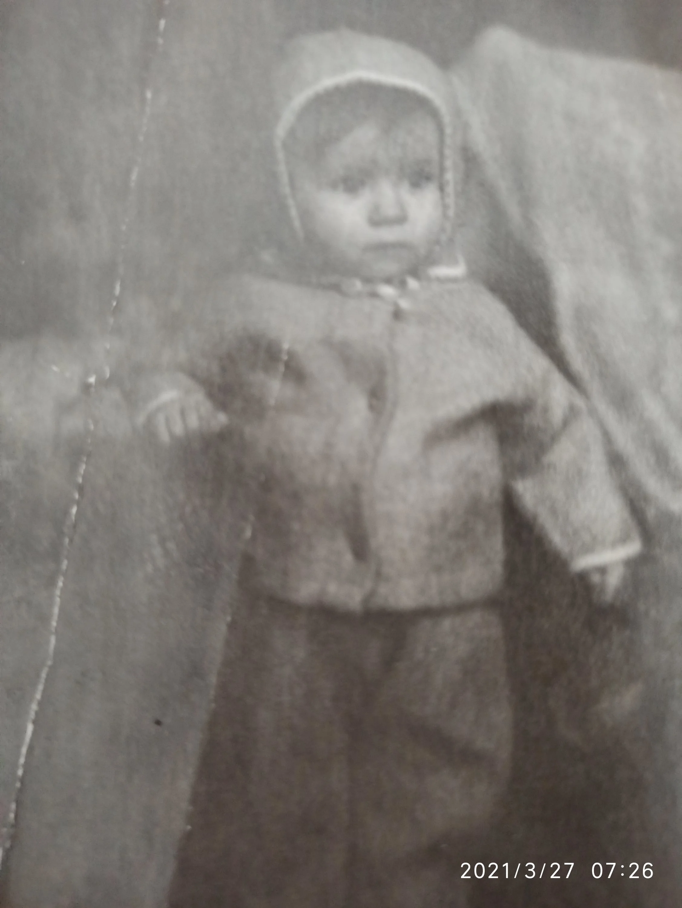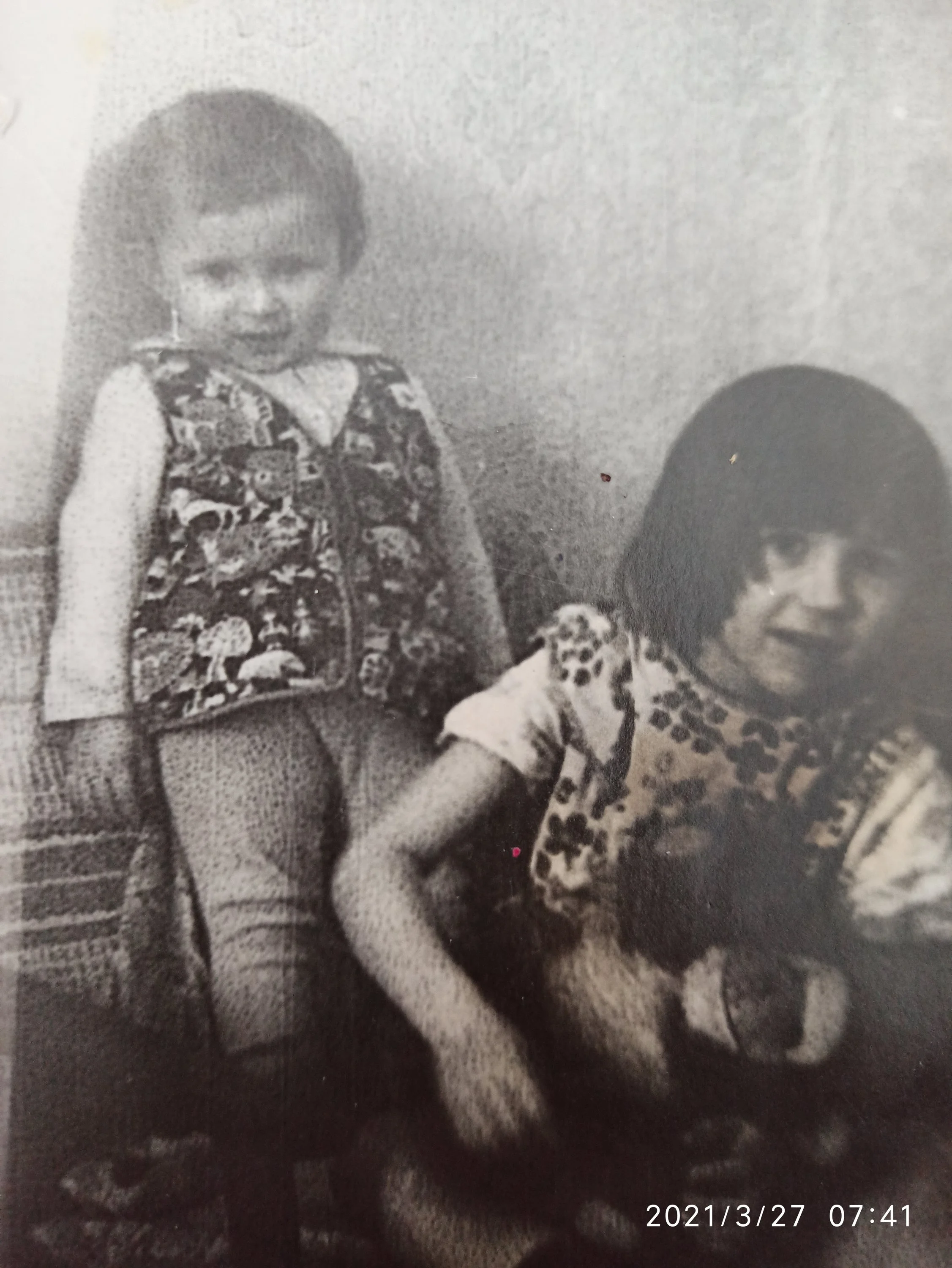Первая прогулка с младшим братом. За кадром стоит папа и что то говорит, а сосед с другой стороны фотографирует. Может есть и более удачные, но мне досталась вот эта.