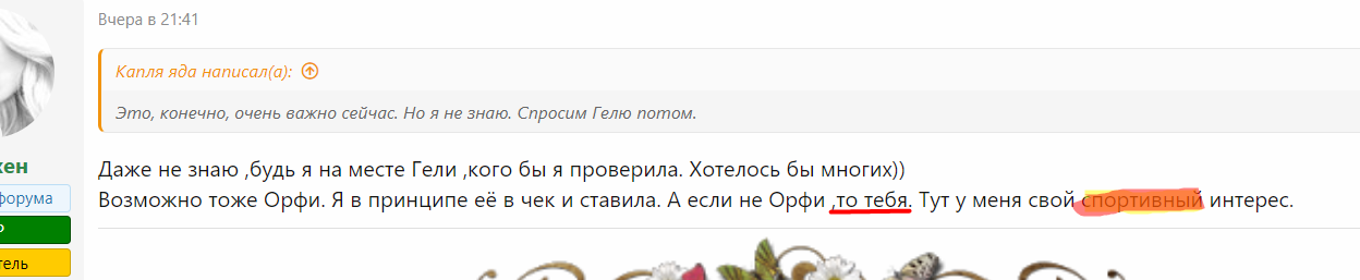 Извиняюсь что меня так мало, ну что сказать Геля была моей красной, соответственно не верить ее ласту у меня оснований нет, Орфи кч, тут тоже все вроде бы понятно, ее многие просили проверить. Не совсем понимаю почему Орфи с Каплей найтись не может по мне Капля красная.