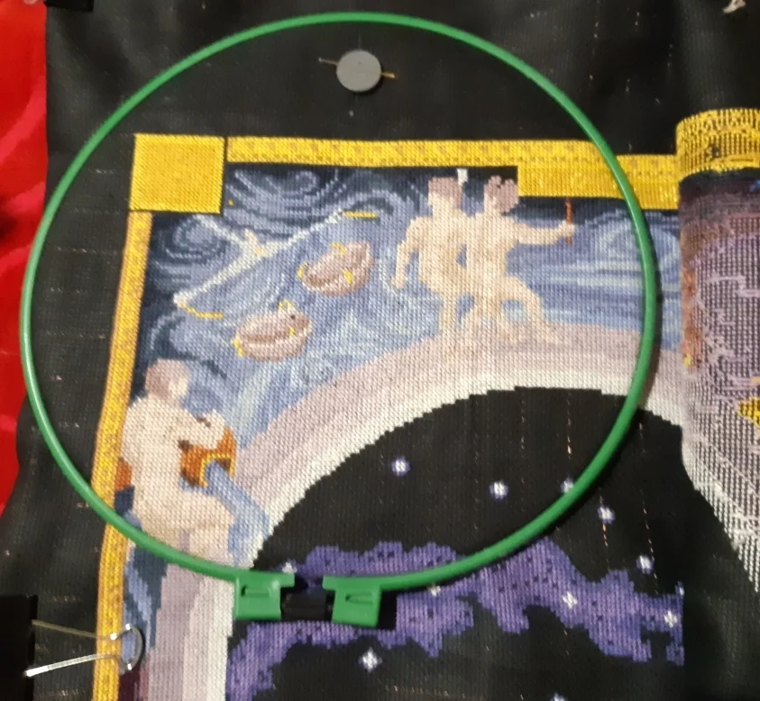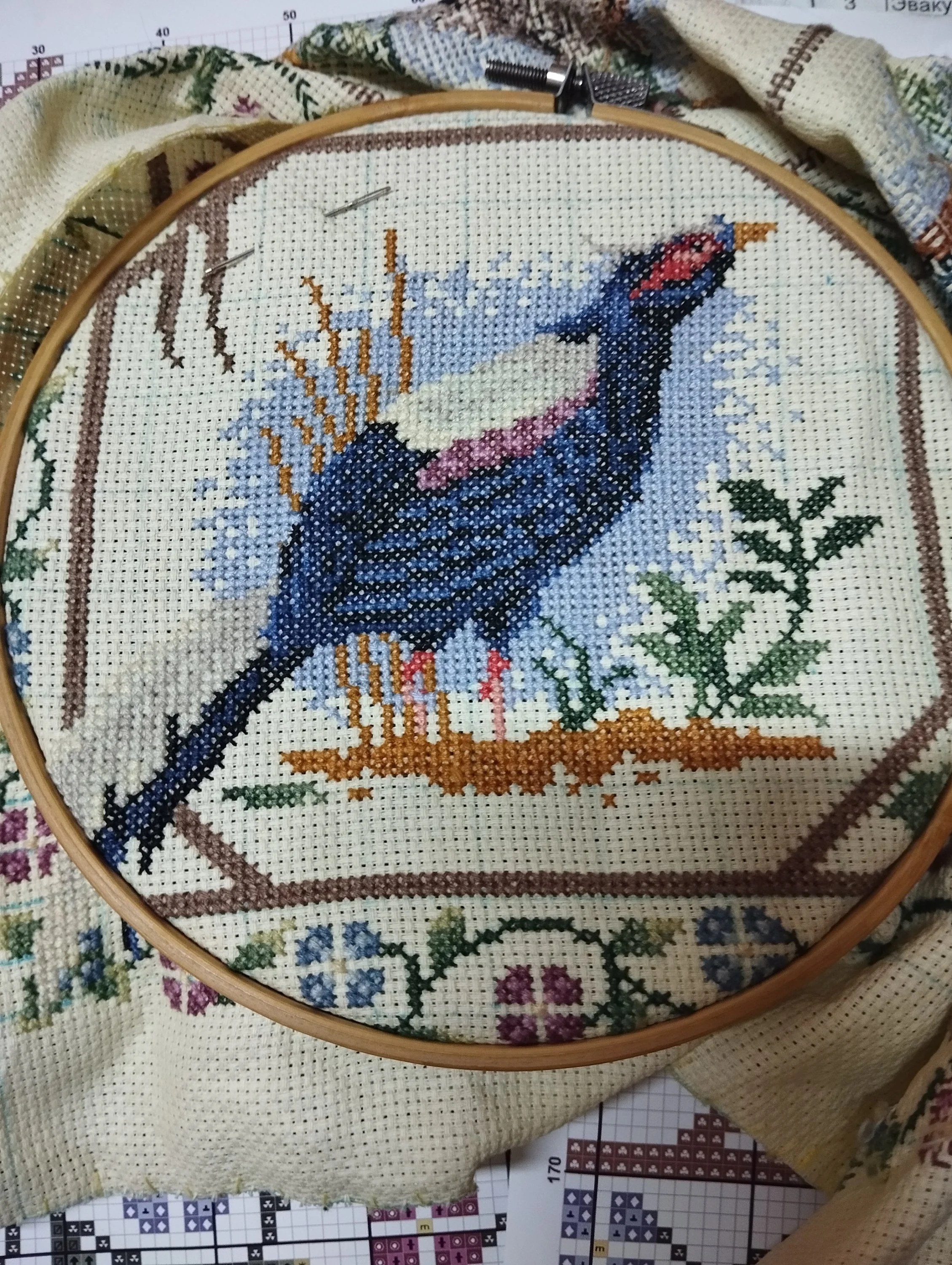 По вышивке-дошила третьего фазанчика и передвинула пяльцы на четвертое окошко Связала немного,от булавочки