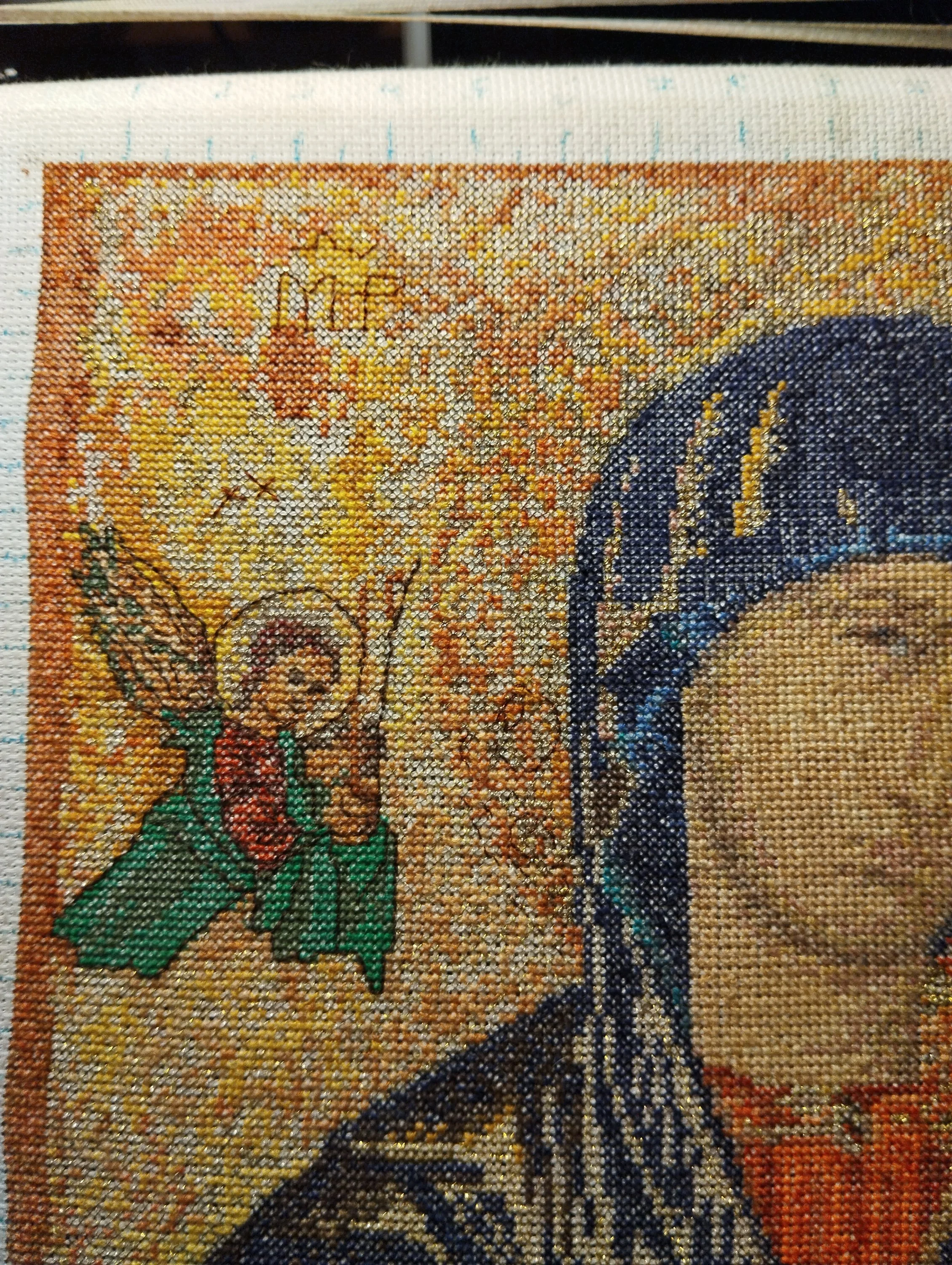 Успела совсем чуть-чуть повышивать бэки на иконе. Закончен левый ангел .Металлизированной нитью "красное золото" начала проходить нимб .